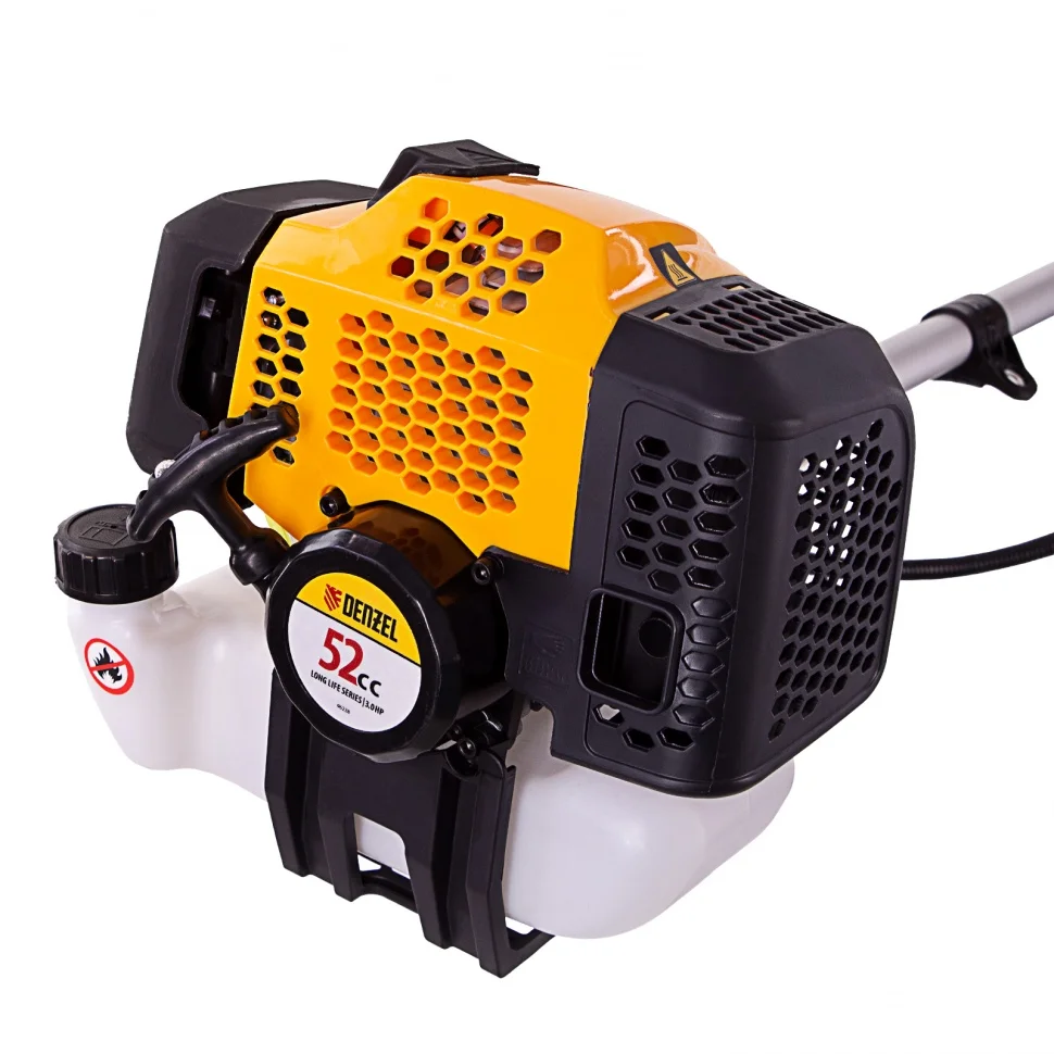 Бензиновый триммер Denzel DGT-520 96238 с неразъемной штангой состоит их 2 частей и оснащен мощным двигателем на 3 л.с., при этом отличается легкостью и экономичным расходом топлива. Детали двигателя покрыты хромом, что значительно увеличивает ресурс инструмента. Усиленная катушка из полиамида легко справится с травой любой густоты даже в недоступных для колесной косилки местах. Пильный диск позволит легко избавиться от молодой поросли деревьев и кустарника.Хорошая сбалансированность инструмента, современная антивибрационная система, подвесной двухплечевой ремень и удобное управление позволяют работать с комфортом даже продолжительное время.Преимущества:Настройка лески без отрыва от работы — достаточно слегка стукнуть шпулей катушки об землю, и леска вытянется до нужной длины.Пусковая система Easy Start — двигатель легко запустить, даже если инструмент долго не использовался.Высокий ресурс — трансмиссионный вал закален токами высокой частоты, алюминиевая штанга отличается увеличенной толщиной стенок 1,5 мм.Экономичный расход топлива — полного бака хватит почти на 45 мин работы при максимальной нагрузке.Полупрозрачный топливный бак — пользователь сможет отслеживать уровень бензина и своевременно заправлять инструмент.Точность ведения и комфортная работа — триммер оснащен велосипедными ассиметричными ручками для наиболее удобного захвата.Простое управление — все клавиши расположены на правой рукоятке, клавиша газа вынесена под большой палец и позволяет экстренно остановить двигатель при необходимости.Безопасность — защитный пластиковый кожух предохраняет пользователя от вылета травы, камней и щепок.Расширенная гарантия 3 года — качество триммера подтверждено производителем.