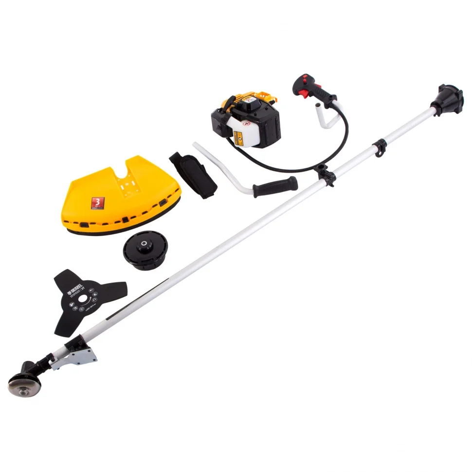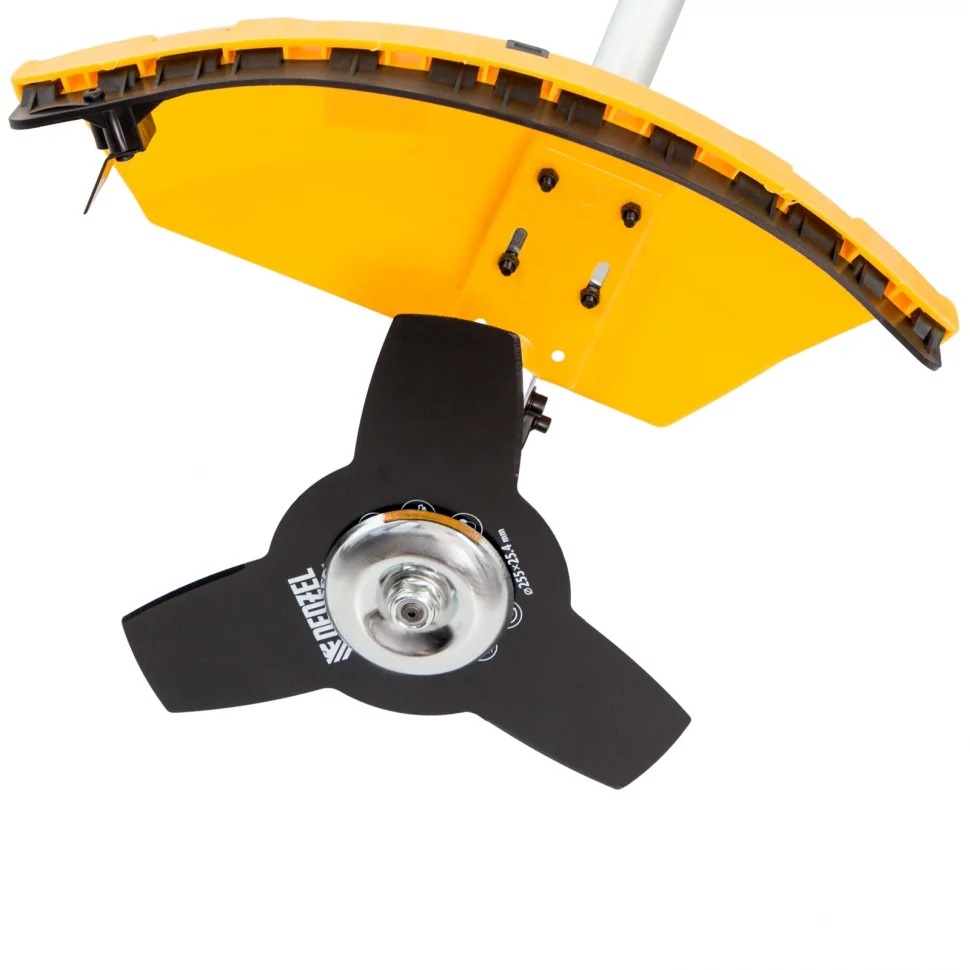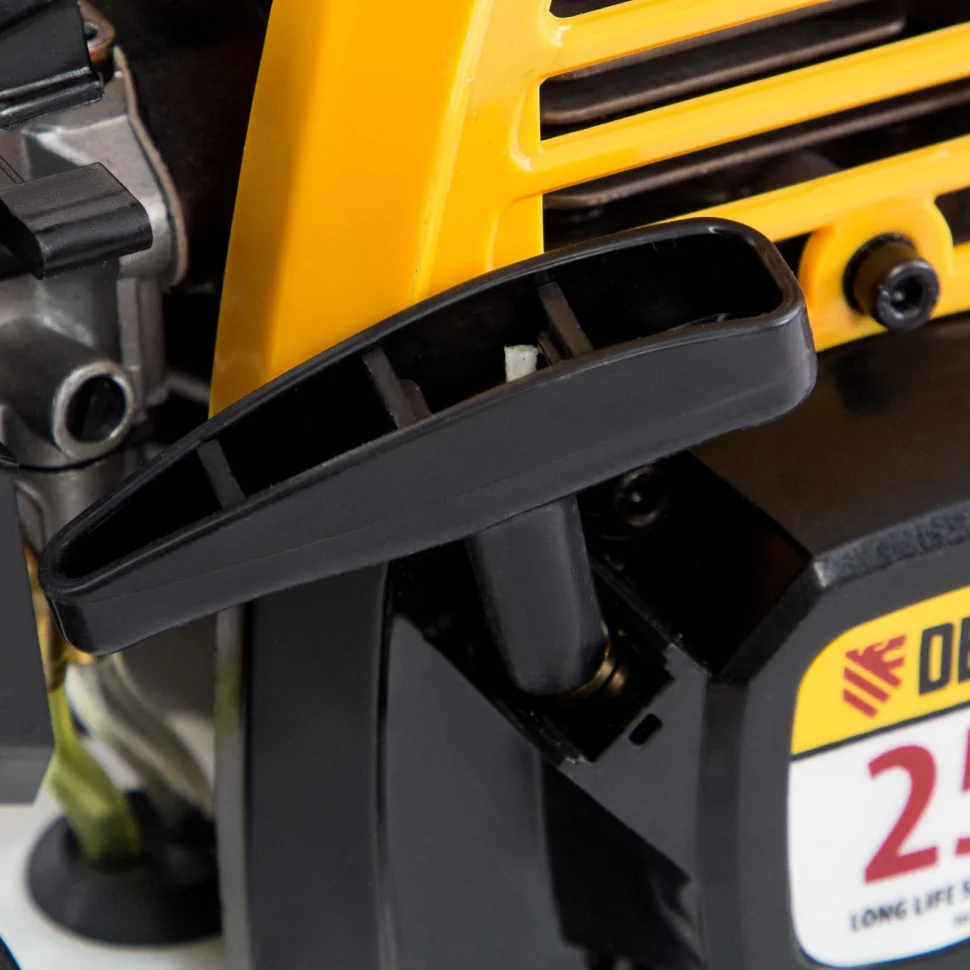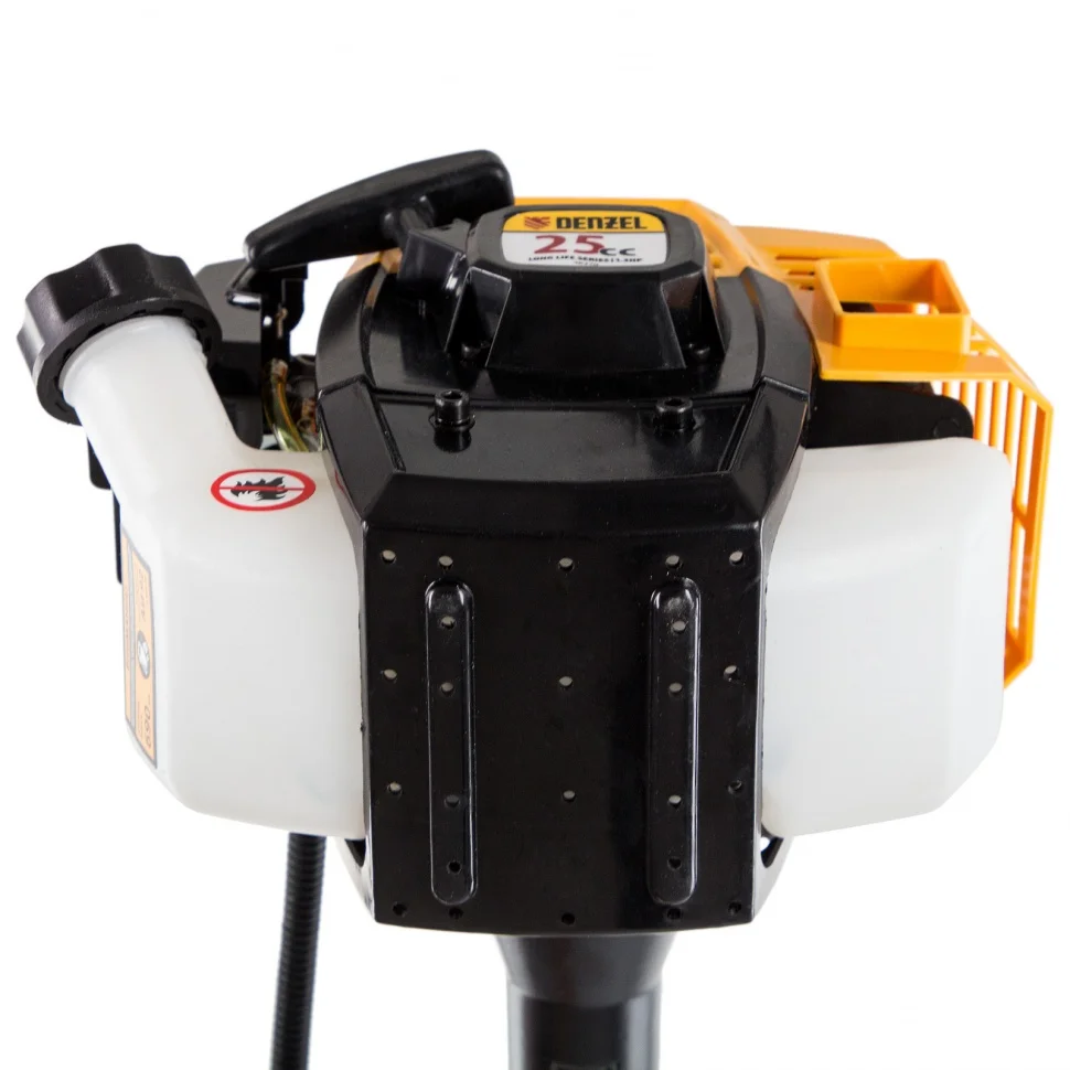 Бензотриммер Denzel DR-25 срезает траву, сорняки, молодые побеги деревьев и кустарники на обширной территории, включая труднодоступные места вдоль стен дома, заборов, вокруг насаждений и т.д. В качестве режущей оснастки используются прочный трехлопастной нож из стали и усиленная катушка из полиамида с леской. Скорость их вращения составляет 9500 об/мин, а ширина скашивания — 25,5 см и 42 см.Одноцилиндровый двухтактный двигатель мощностью 1,3 л.с. работает от смеси бензина с маслом, которые не нужно заливать по отдельности. В комплект поставки включен удобный дозатор для приготовления топлива, облегчающий обслуживание триммера. Благодаря отсутствию проводов триммер практически не зависит от погодных условий и может использоваться вдали от дома. Преимущества:Ударопрочный корпус закрывает двигатель от внешних воздействий и защищает оператора от ожогов. А вентиляционные отверстия предотвращают перегрев двигателя.Защитный кожух предотвращает попадание грязи, камней и скошенной травы на оператора.Надежный редуктор обеспечивает эффективное скашивание на высоких оборотах двигателя.Двигатель экономно потребляет топливо, поэтому не придется часто наполнять бензобак. На одной заправке можно проработать до 1 часа.Полуавтоматическая катушка позволяет увеличить длину лески прямо в процессе скашивания, не снижая оборотов двигателя.Лишняя длина лески автоматически отсекается ограничительным ножом, который расположен на защитном кожухе. Это позволяет избежать перегрева и перегрузки двигателя.Асимметричная велосипедная ручка обеспечивает широкий захват и позволяет двумя руками контролировать ход триммера.Одноплечевой ремень эффективно распределяет нагрузку на опорно—двигательный аппарат, делая комфортной даже длительную эксплуатацию.Защита бедра на плечевом ремне предотвращает удары триммерной штанги о ногу и появление синяков.Амортизаторы в конструкции триммера эффективно гасят вибрации, защищая здоровье оператора и позволяя с комфортом выполнять большой объем работы.Масса триммера 5.8 кг делает простой его транспортировку по рабочему участку.Гарантийный срок на триммер продлен до 3-х лет, средний срок эксплуатации составляет минимум 5 лет.