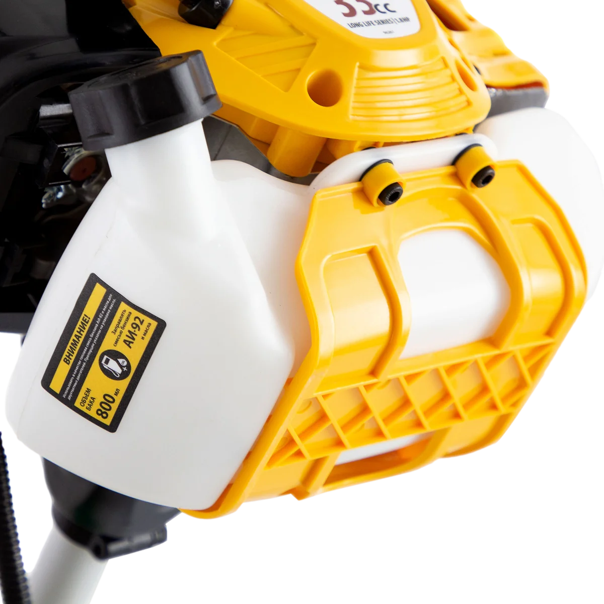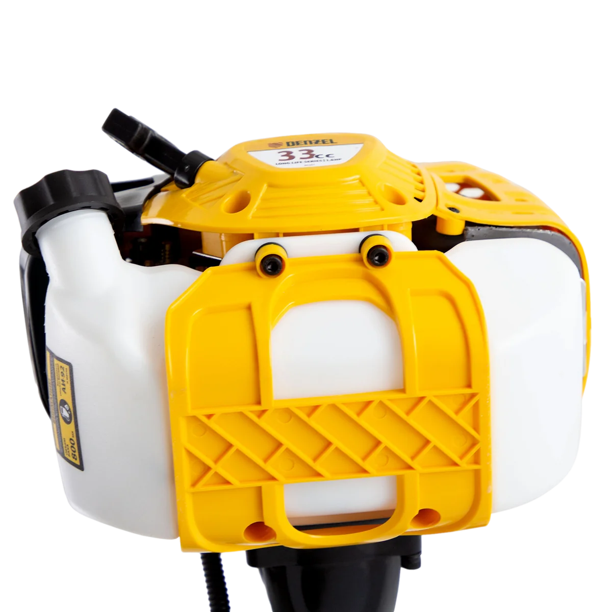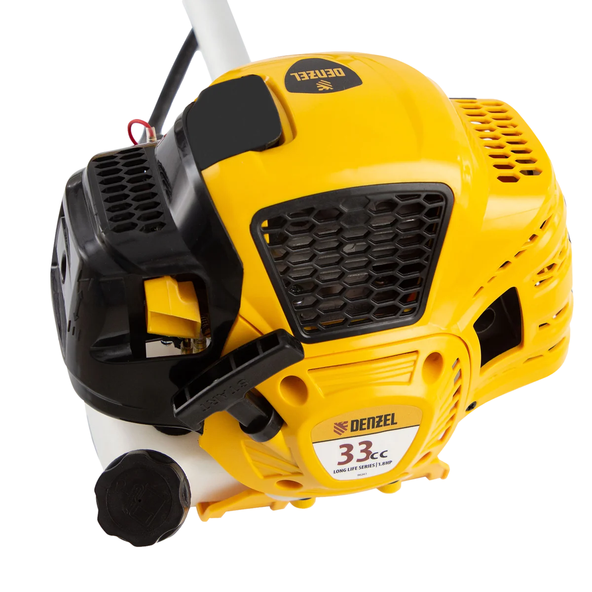 Бензиновый триммер Denzel DTL-33 96261 с объемом двигателя 33 см3 и неразъемной штангой подходит как для частичного подравнивания газона, так и скашивания травы всех типов, в том числе с жесткими древовидными стеблями (полыни, крапивы, лебеды, борщевика). Также эффективен для срезания кустарника и молодых побегов деревьев с диаметром стволов до 10 мм. Два режущих инструмента — леска и пильный диск — работают на скорости 9500 об/мин и обеспечивают ширину скашивания 42 и 25,5 см соответственно.Двигатель мощностью 1,8 л.с. экономично потребляет топливо, поэтому часто заправлять бак не придется. Триммер не требует подключения к стационарному источнику питания и может использоваться в самом отдаленном уголке дачного участка. ПреимуществаВысокий ресурс поршневой группы — цилиндр, покрытый пористым хромом и хонингованный, обеспечивает стабильную и долгую работу двигателя.Контроль уровня топлива — прозрачные стенки позволяют отслеживать степень наполненности бензобака.Блокировка газа — случайный запуск двигателя исключен, что обеспечивает безопасность пользователя.Полуавтоматическая подача лески — увеличить длину корда можно легким ударом шпули о землю, при этом работу двигателя останавливать не придется.Автоматическое укорачивание лески — в случае, если длина корда превышает допустимую, лезвие на кожухе триммера подрезает его, предотвращая лишнюю нагрузку на двигатель и его перегрев.Безопасная работа — защитный кожух закрывает режущую часть, поэтому в сторону пользователя не отлетают ветки и камни.Быстрая смена оснастки — установка режущего элемента занимает несколько секунд.Удобное управление — эргономичная рукоятка асимметричной формы обеспечивает удобный хват.Комфортная работа — плечевой ремень снижает нагрузку на руки, защита бедра предотвращает появление синяков от ударов штангой.Антивибрационная система — специальные амортизаторы снижают воздействие вибраций на организм пользователя, сохраняя суставы здоровыми.Мобильность — вес триммера составляет всего 7 кг, поэтому его легко перемещать.Удобное приготовление топливной смеси — дозатор для смешивания бензина и масла прилагается к триммеру.Дополнительные возможности — можно приобрести и установить на триммер диски Denzel 96323, 96325 для быстрого удаления растительности с жесткими стеблями (полыни, крапивы, лебеды) или 96328 для скашивания молодых побегов кустарника диаметром до 3 мм.Гарантия 3 года — высокое качество подтверждено производителем.