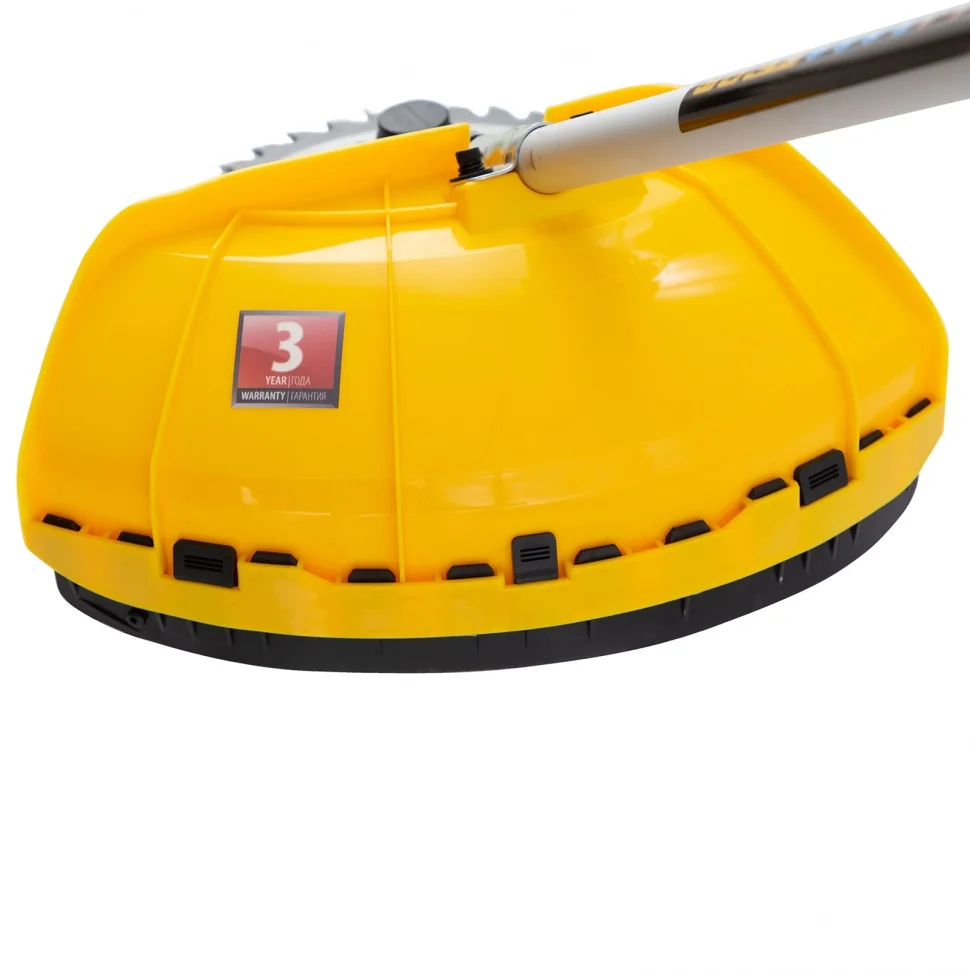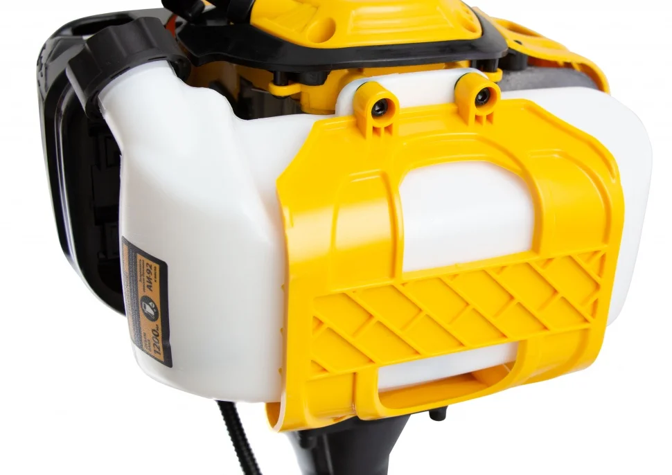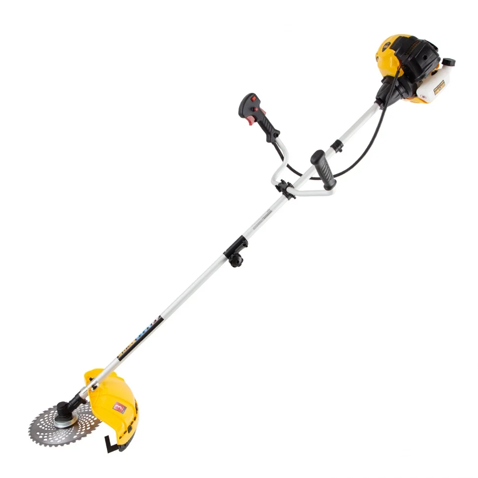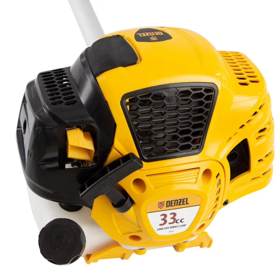 Бензиновый триммер Denzel DTL-33S предназначен для ухода за газонной травой, скашивания сорняков и подравнивания небольших кустарников. Он комплектуется двумя режущими инструментами: леской и стальным ножом. Ширина скашивания составляет 25,5 см или 42 см, в зависимости от выбранной насадки.Бензотриммер работает на топливе и не зависит от электросети, поэтому его можно брать с собой для работы на отдаленных участках, а также с удобством маневрировать, не боясь повредить провод. Преимущества:Цилиндр двигателя покрыт пористым хромом и хонингован, поэтому поршневая группа отличается высоким ресурсом.Защитный кожух предотвращает попадание разлетающихся камней и веток на пользователя.Полуавтоматическая система подачи лески обеспечивает быстрое увеличение ее длины. Достаточно слегка стукнуть шпулей о землю, не сбавляя оборотов двигателя.Ограничительный нож автоматически подрезает лишнюю леску, исключая повышенную нагрузку на двигатель и его перегрев.Режущая леска легко меняется на трехлопастный стальной нож и обратно, что позволяет быстрее справляться с работой.Двигатель экономно расходует топливо, а прозрачные стенки топливного бака помогают следить за его расходом.Штанга состоит из двух частей, поэтому триммер не занимает много места при хранении и транспортировке.Велосипедная асимметричная ручка идеально ложится в руки, дополнительный комфорт обеспечивают прорезиненные рукоятки.Плечевой ремень с защитой бедра регулируется под рост оператора. Он не только снимает часть нагрузки с рук, но и предотвращает неприятные удары о ногу.Оптимизированная амортизационная система гасит вибрации и обеспечивает безопасную работу без вреда для здоровья.Надежный редуктор, усиленная система сцепления и высокопрочные материалы позволили повысить гарантию на триммер до 3-х лет.Триммер весит всего 7.6 кг, поэтому его комфортно удерживать в руках и переносить.