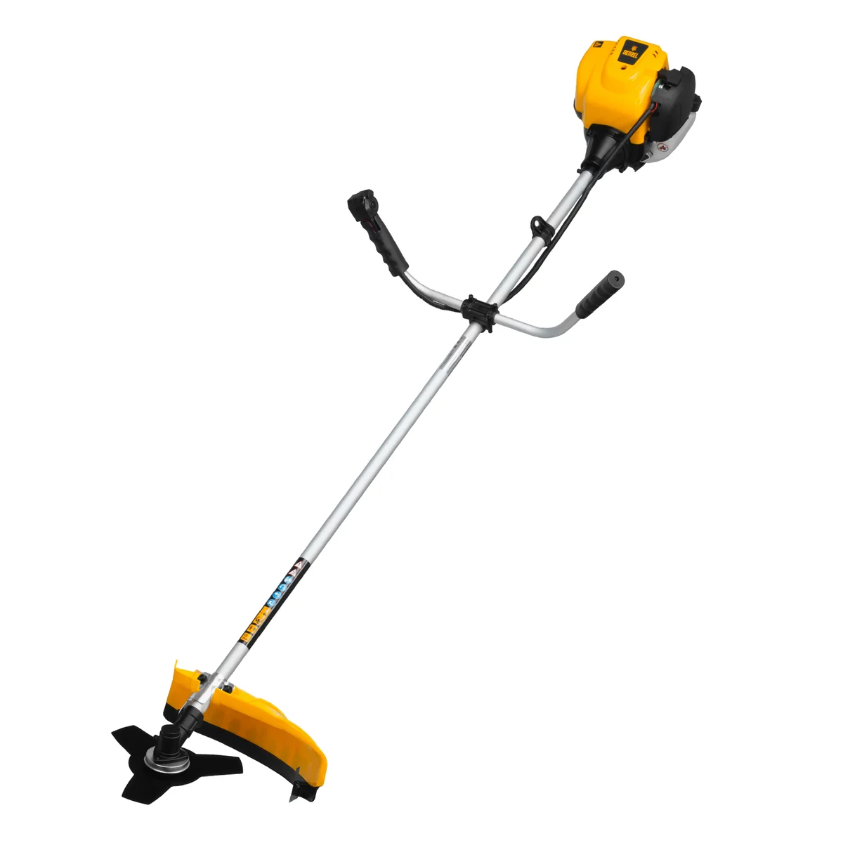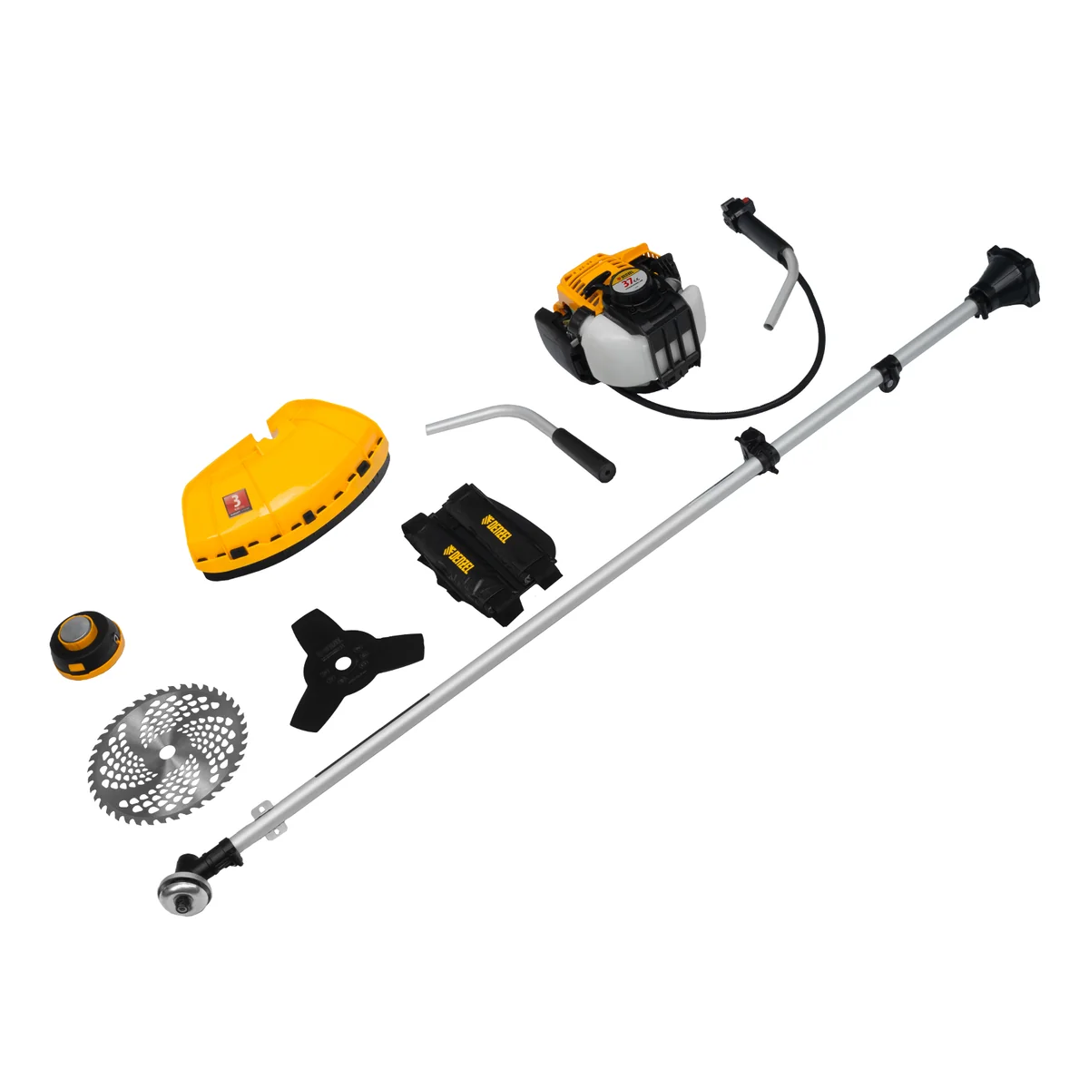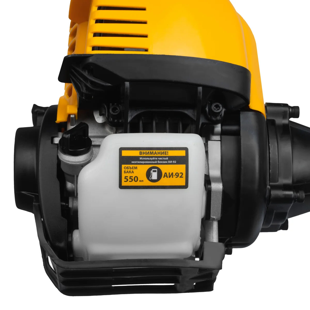 Бензиновый триммер Denzel DTL-37-4T 96267 с 4-тактным двигателем объемом 37 см3, с неразъемной штангой, состоит из 2 частей. Позволяет не только ухаживать за газоном, но и скашивать траву различных типов, в том числе с жесткими стеблями (полынь, крапиву, лебеду), а также срезать борщевик, кустарник и молодые побеги деревьев с ветвями диаметром до 10 мм. В комплекте поставки сразу 3 оснастки: леска с шириной скашивания 42 см, трехлопастный нож с шириной скашивания 25,5 см и пильный диск.