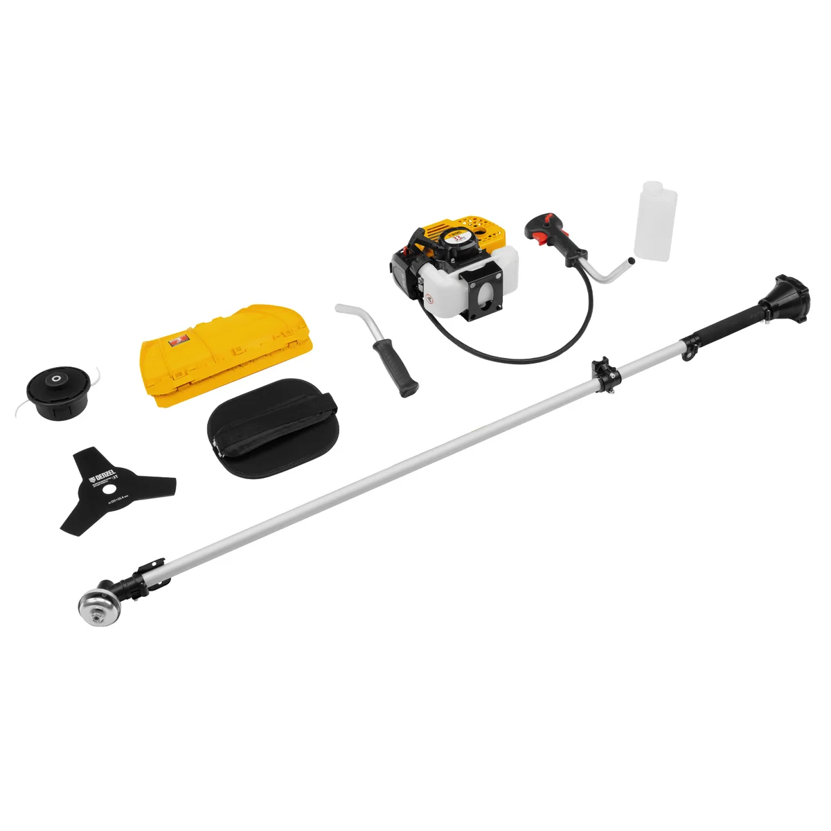 Триммер бензиновый Denzel DTS-33 962115 с двигателем объемом 33 куб. см и неразъемной штангой поставляется комплектом из 2 частей. Усиленная катушка с леской предназначена для скашивания мягкой травы, а трехлопастный нож &mdash, для борьбы с густыми зарослями, многолетними сорняками, молодым кустарником и растительностью с толстыми стеблями. Ширина прохода леской составляет 42 см, ножом &mdash, 25,5 см, что позволяет выполнять большие объемы работ.Двухтактный бензиновый двигатель мощностью 1,8 л. с. обеспечивает эффективное решение поставленных задач и полную автономность. Работать можно даже в самых отдаленных участках сада, не заботясь о наличии сети электропитания.ПреимуществаВысококачественное исполнение &mdash, надежный редуктор, двигатель с хромированным цилиндром и прочное сцепление обеспечивают стабильную работу триммера.Система легкого запуска Easy Start &mdash, трос стартера вытягивается легко и без рывков, что упрощает начало работы.Легкое включение &mdash, праймер для подкачки топлива упрощает запуск двигателя, поэтому включить триммер даже после долгого простоя будет несложно.Защита от случайного пуска &mdash, блокиратор курка газа предотвращает включение триммера по неосторожности, обеспечивая безопасность пользователя.Удобная работа без усталости &mdash, одноплечевая подвесная система перераспределяет вес бензотриммера, а мягкая защита бедра позволяет снизить уровень вибраций и избежать ударов.Безопасная эксплуатация &mdash, прочный кожух, закрывающий оснастку, защищает пользователя от летящей травы, грязи и мелких камней.Легкое обновление лески &mdash, достаточно слегка ударить полуавтоматической катушкой по земле, не снижая оборотов двигателя, что позволяет быстрее справиться с работой.Специальный нож на фартуке кожуха &mdash, концы лески подрезаются до нужной длины, это позволяет предотвратить перегрузку двигателя.Эргономичность &mdash, рукоятки велосипедного типа обеспечивают правильное положение рук, что делает работу с триммером комфортной.Быстрая подготовка к работе &mdash, бензотриммер поставляется с уже установленным на штангу редуктором и корпусом сцепления.Удобный дозатор в комплекте &mdash, емкость для приготовления топливной смеси не придется приобретать отдельно.Гарантия на заводской брак 3 года &mdash, качество и надежность инструмента подтверждены производителем.