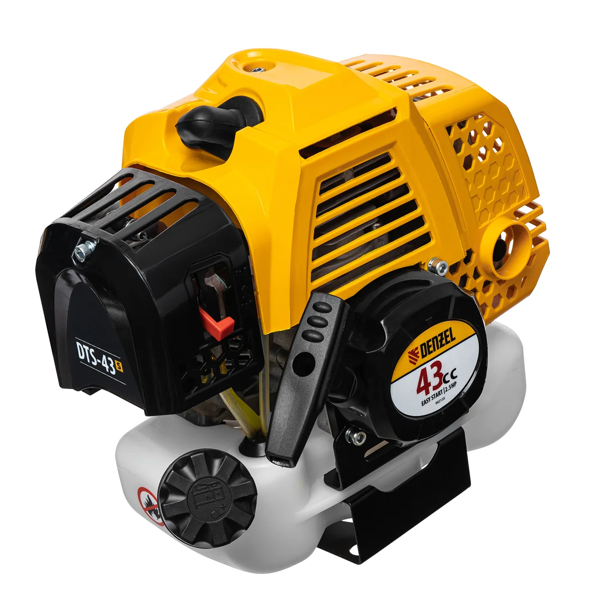 Триммер бензиновый Denzel DTS-43S 962145 с двигателем объемом 43 куб. см и разъемной штангой (состоит из 2 частей), используется для скашивания травы любой густоты, выравнивания кромок газонов, избавления от сорняков и растительности с толстыми стеблями. Комплектуется двумя режущими оснастками &mdash, усиленной катушкой с леской и трехлопастным стальным ножом. Ширина скашивания леской составляет 42 см, а ножом &mdash, 25,5 см, поэтому триммер характеризуется высокой производительностью.Двухтактный бензиновый двигатель мощностью 2,5 л. с. обеспечивает эффективное решение поставленных задач и полную автономность. Работать можно даже в самых отдаленных участках сада, не заботясь о наличии сети электропитания.ПреимуществаВысококачественное исполнение &mdash, надежный редуктор, двигатель с хромированным цилиндром и прочное сцепление обеспечивают стабильную работу триммера.Система легкого запуска Easy Start &mdash, трос стартера вытягивается легко и без рывков, что упрощает начало работы.Легкое включение &mdash, праймер для подкачки топлива упрощает запуск двигателя, поэтому включить триммер даже после долгого простоя будет несложно.Защита от случайного пуска &mdash, блокиратор курка газа предотвращает включение триммера по неосторожности, обеспечивая безопасность пользователя.Удобная работа без усталости &mdash, одноплечевая подвесная система перераспределяет вес бензотриммера, а мягкая защита бедра позволяет снизить уровень вибраций и избежать ударов.Безопасная эксплуатация &mdash, прочный кожух, закрывающий оснастку, защищает пользователя от летящей травы, грязи и мелких камней.Легкое обновление лески &mdash, достаточно слегка ударить полуавтоматической катушкой по земле, не снижая оборотов двигателя, что позволяет быстрее справиться с работой.Специальный нож на фартуке кожуха &mdash, концы лески подрезаются до нужной длины, это позволяет предотвратить перегрузку двигателя.Эргономичность &mdash, рукоятки велосипедного типа обеспечивают правильное положение рук, что делает работу с триммером комфортной.Быстрая подготовка к работе &mdash, бензотриммер поставляется с уже установленным на штангу редуктором и корпусом сцепления.Разборная штанга &mdash, триммер удобен в хранении и транспортировке.Удобный дозатор в комплекте &mdash, емкость для приготовления топливной смеси не придется приобретать отдельно.Гарантия на заводской брак 3 года &mdash, качество и надежность инструмента подтверждены производителем.