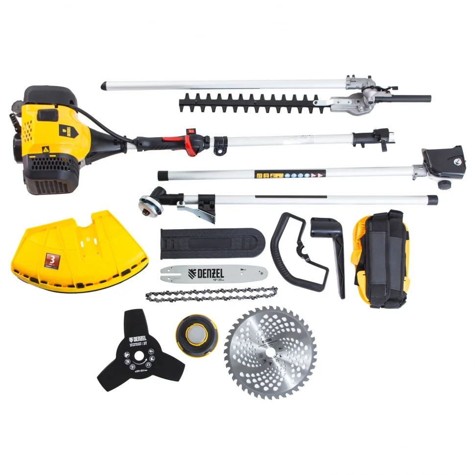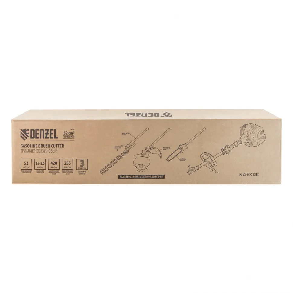 Мультифункциональный бензиновый триммер Denzel DGT-52S-MAX 96279 с двигателем объемом 52 куб. см и разъемной штангой предназначен для обработки газонов, избавления от сорняков, скашивания молодой травы, а также для борьбы с зарослями. Выдерживает интенсивные нагрузки, поэтому подойдет не только владельцам дачных участков, но и сотрудникам сельскохозяйственных организаций и коммунальных служб.