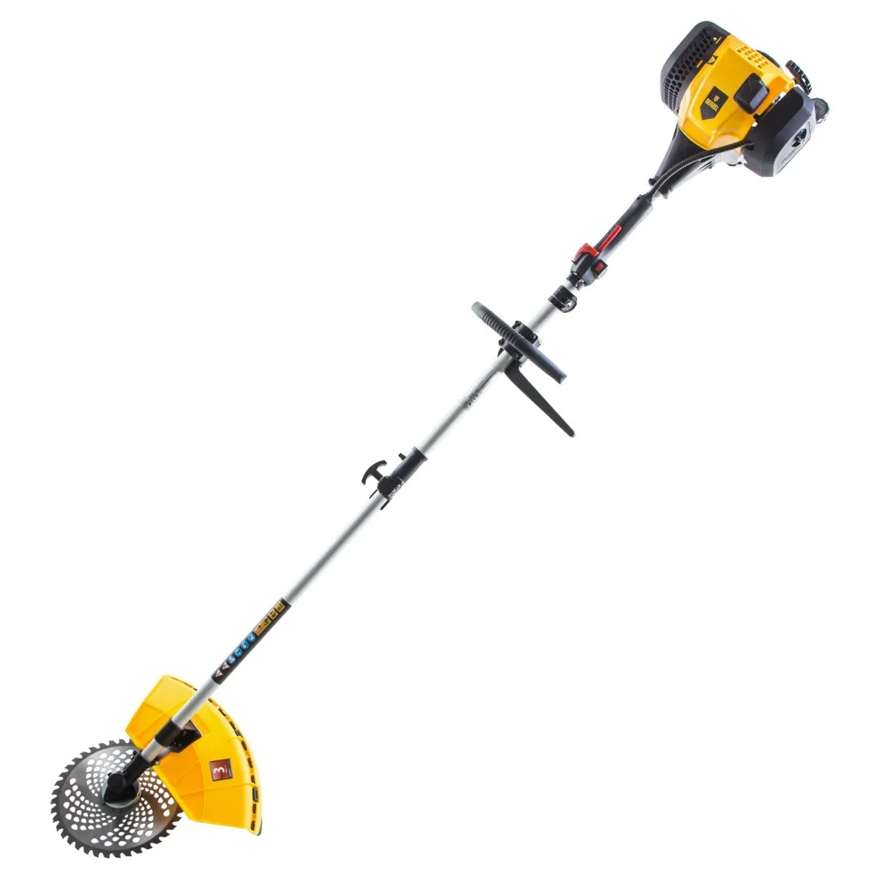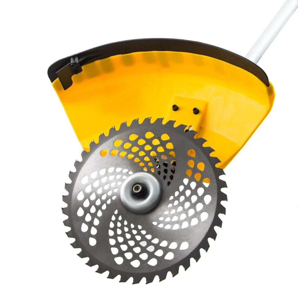 Триммер универсален по своему применению. Катушка с леской и нож позволяют ухаживать за газоном, скашивать траву с жесткими стеблями (полынь, крапиву, лебеду). Пильный диск легко справляется с жесткими древовидными стеблями борщевика, а также с обрезкой кустарника и молодых побегов деревьев с диаметром стволов до 10 мм. Кусторез и высоторез пригодятся, чтобы придать форму декоративным кустам, создать живую изгородь и обрезать крупные ветки деревьев. Мощный двигатель на 3 л.с. и частота вращения оснастки 9500 об/мин позволяют эффективно бороться с растительностью — за час можно обработать участок площадью до 20 соток.