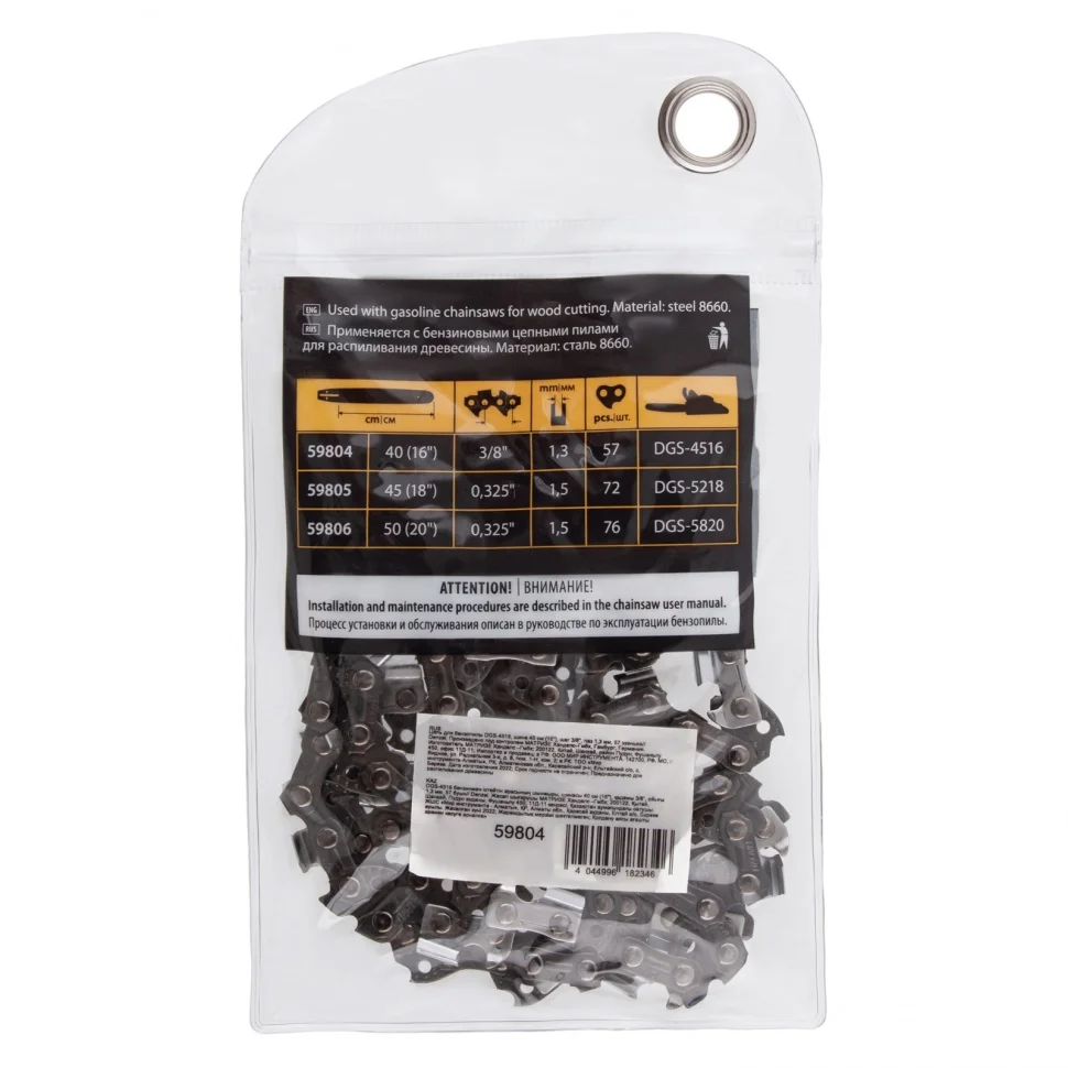 Цепь Denzel 59804 рассчитана на применение с бензопилой Denzel DGS-4516. Состоит из 57 звеньев, надевается на пильную шину длиной 40 см, поэтому отлично подходит для обработки деревянных заготовок в частных мастерских, распиловки бревен, срезания сучьев и веток в саду, также пригодится на охоте и рыбалке.Преимущества:Цепь сделана из легированной стали, поэтому хорошо справляется с ударными нагрузками, устойчива к коррозии и применима даже для распиловки льда.Благодаря чипперному, т.е. серпообразному типу режущего звена цепь легко затачивается и практически не загрязняется.Технология лазерной заточки цепи обеспечивает ровные спилы и предотвращает перегрев двигателя.Система автоматической подачи масла к цепи увеличивает срок ее службы.Защитная упаковка предотвращает ранение об острые звенья цепи.