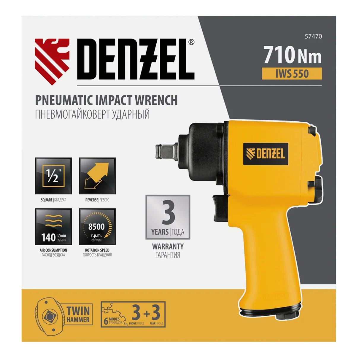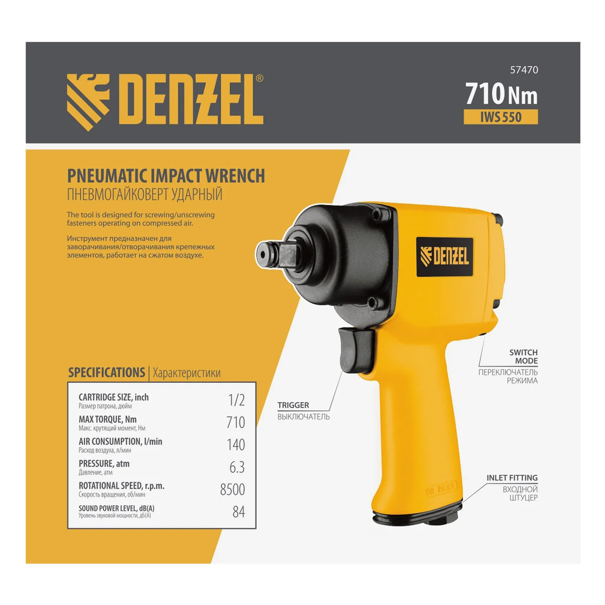 Ударный пневмогайковерт IWS550 Compact, 1/2", 8500 об/мин, 710 Нм Denzel 57470
