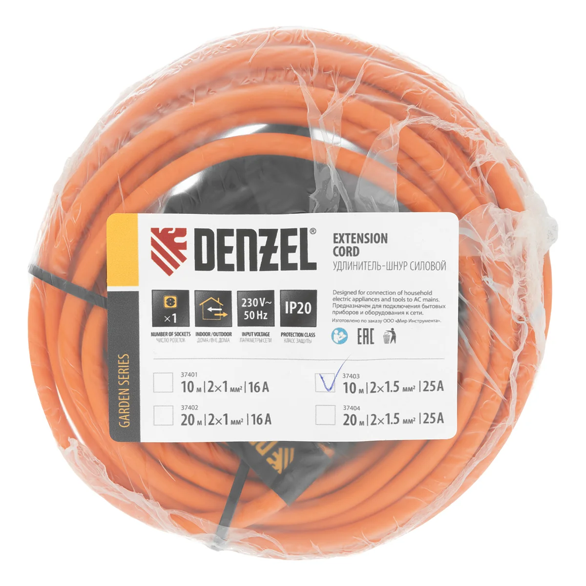 Силовой удлинитель-шнур Denzel Garden Series 37403 с кабелем ПВС сечением 2 x 1,5 мм и 1 розеткой без заземления, позволяет подключать приборы к электросети на расстоянии до 10 м от стационарного источника питания. Максимальная мощность потребителя составляет 4400 Вт при полностью размотанном кабеле и 2200 Вт — при смотанном. Удлинитель может использоваться при температуре от +5 до +35 °C. Пригодится дома, на даче, в гараже.