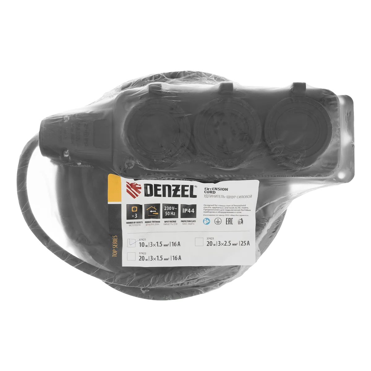 Силовой удлинитель-шнур Denzel Top Series 37421 с 3 розетками, с кабелем КГТТ сечением 3 x 1,5 мм и длиной 10 м, предназначен для подключения электроприборов на удалении от розетки. Суммарная мощность потребителей составляет 3680 Вт для полностью размотанного кабеля и 1840 Вт — для смотанного. Удлинитель подходит для подключения электроинструмента, будет полезен на строительной площадке и в быту.