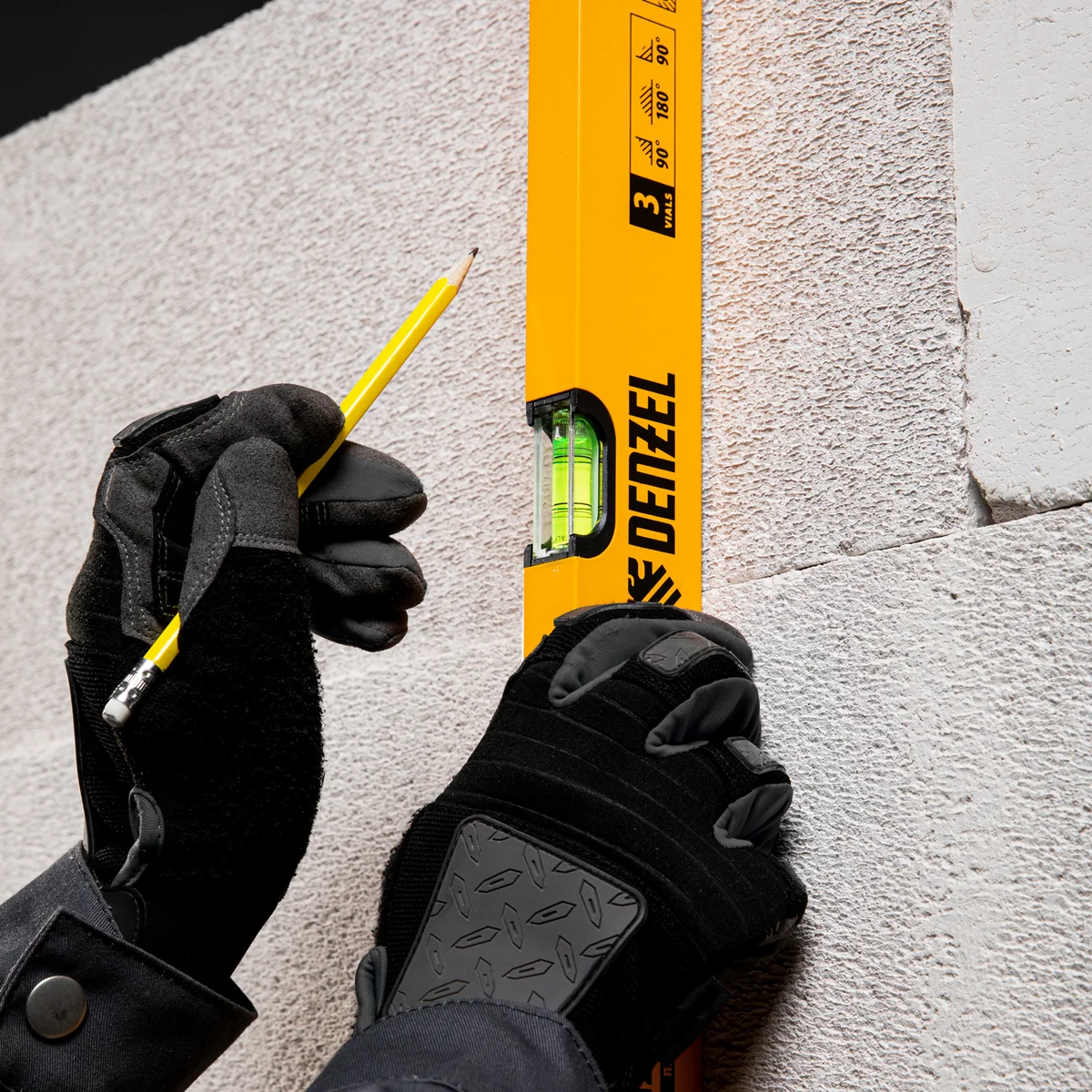 Алюминиевый фрезерованный уровень Denzel 33684 длиной 1200 мм, с 3 глазками, используется для контроля расположения вертикальных и горизонтальных плоскостей. Благодаря инструменту риск погрешности да снижается, что позволяет получить качественный результат.Для определения отклонения вертикали 90 градусов необходимо использовать пузырьковую ампулу только в верхнем положении уровня. Только базовая поверхность является рабочей (противоположная ампуле 180 градусов).ПреимуществаАмпулы уровня закрыты стенками из поликарбоната для защиты от ударов.Погрешность измерений сведена к минимуму (0,5 мм/м), т.к. базовая поверхность фрезерована.Алюминиевый профиль выступает залогом конструкционной прочности инструмента.Электронный контроль при монтаже пузырьковых ампул гарантирует высокую точность замеров.