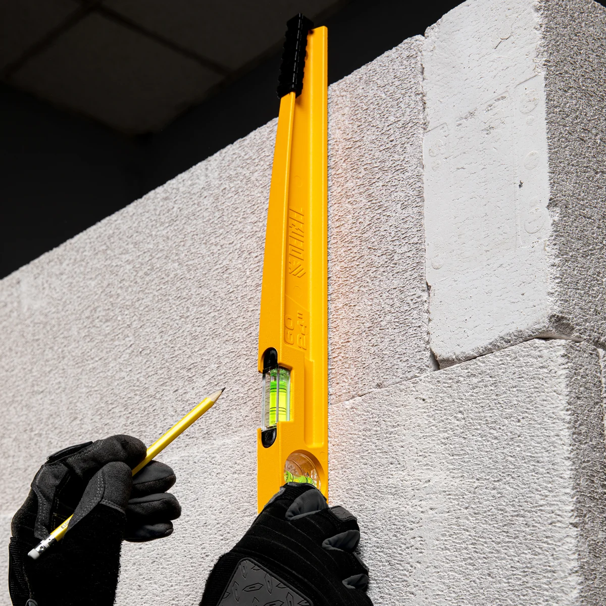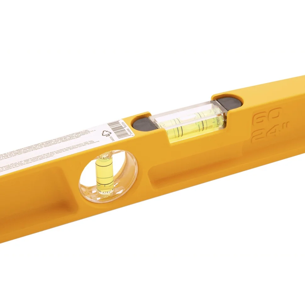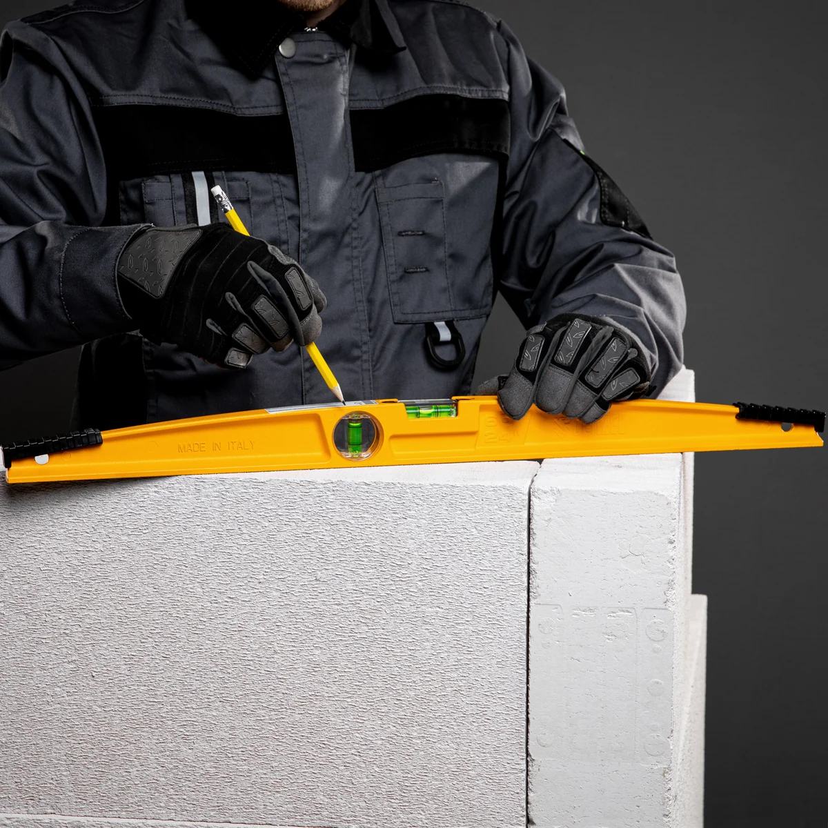 Литой уровень Denzel 34935 длиной 600 мм, с 2 глазками и ударными площадками, поможет выполнить максимально точные измерения в горизонтальной и вертикальной плоскостях. Благодаря инструменту значительно ускоряется и упрощается монтаж конструкций, укладка плитки, брусчатки и т.д. Для определения отклонения вертикали 90 градусов необходимо использовать пузырьковую ампулу только в верхнем положении уровня. Только базовая поверхность является рабочей (противоположная ампуле 180 градусов).Преимущества Корпус отличается прочностью и долговечностью, т.к. выполнен из алюминиевого профиля методом литья. Ударные площадки позволяют наносить несильные удары резиновой киянкой для дополнительного выравнивания плитки и других материалов. Погрешность измерений сведена к минимуму и составляет всего 0,5 мм/м. 10-летняя гарантия на пузырьковые ампулы подтверждает их качество.