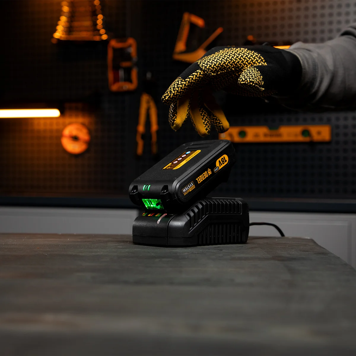- Компактность и легкий вес 390 г — зарядное устройство не занимает много места, его удобно брать с собой на рабочую площадку.