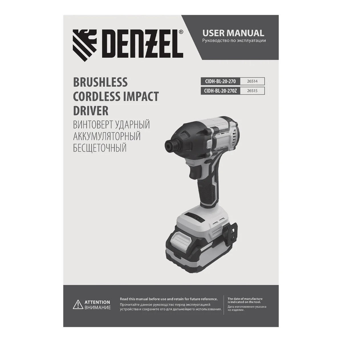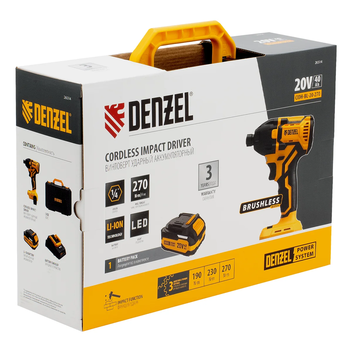 Винтоверт ударный аккумуляторный бесщет. CIDH-BL-20-270, Li-Ion, 20 В Denzel 26514