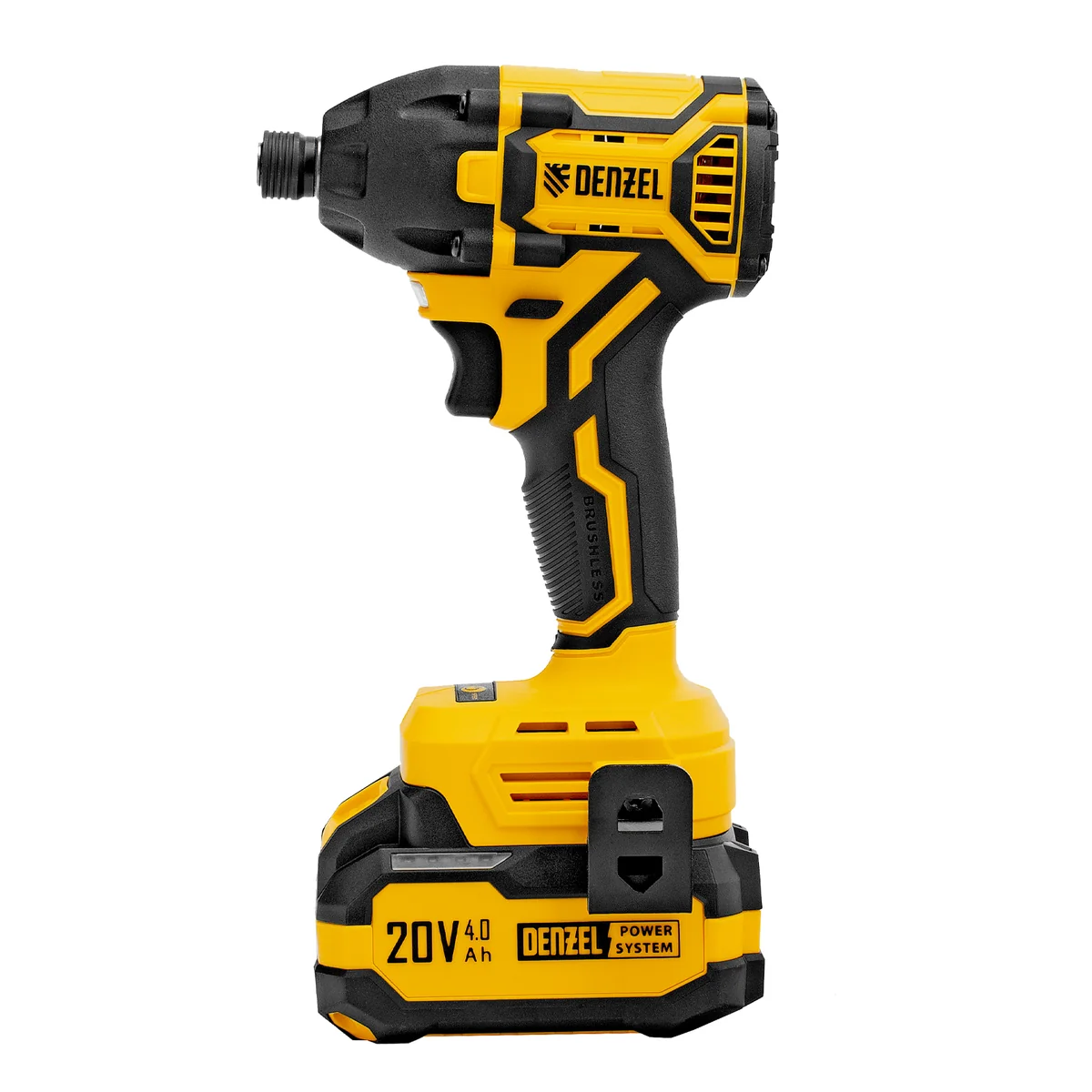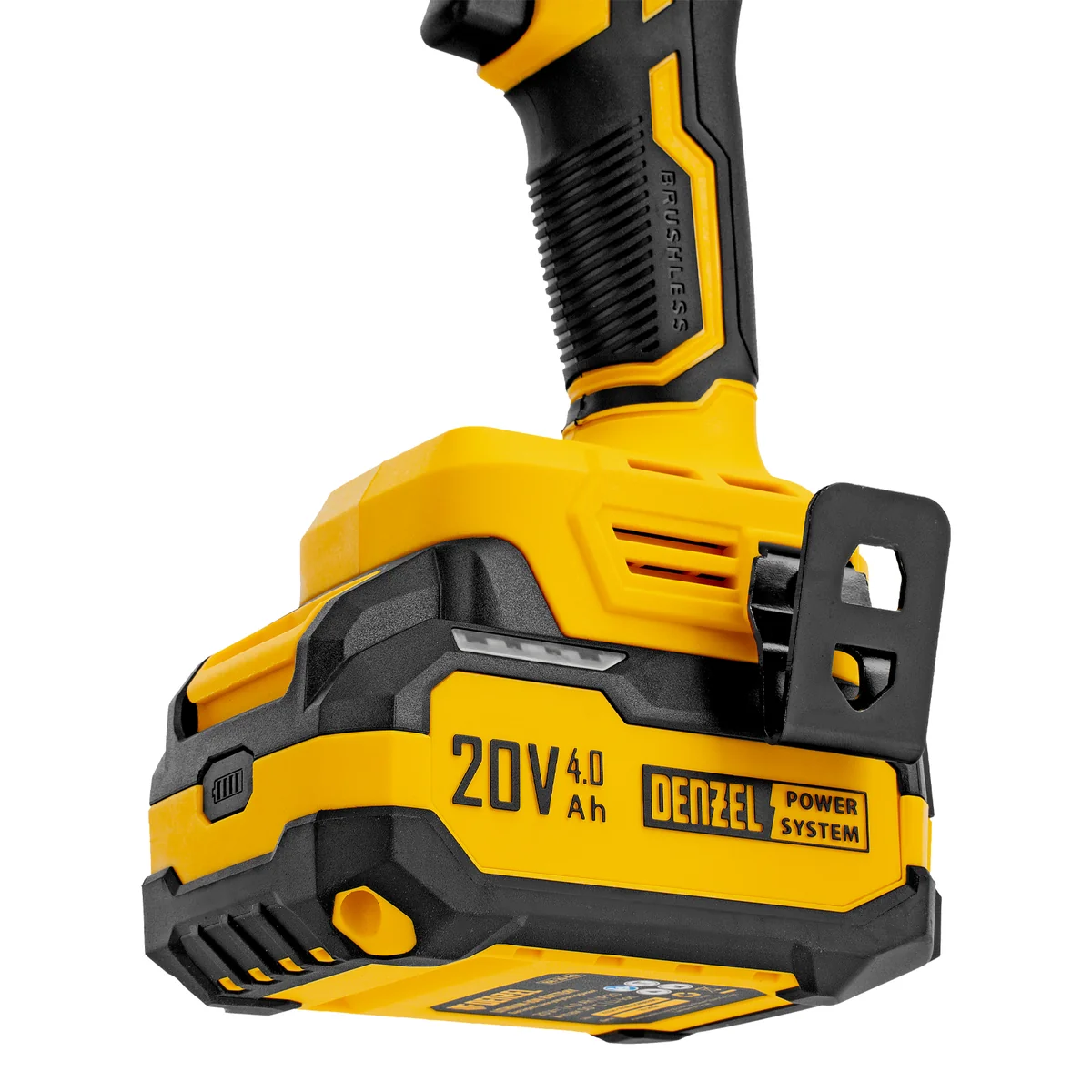 - Универсальность — аккумулятор Li-Ion емкостью 4 А·ч совместим со всеми инструментами единой платформы Denzel Power System 20V.