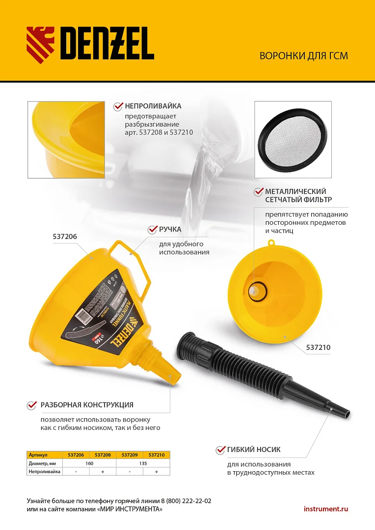Пластиковая воронка Denzel 537209 диаметром 135 мм, с металлическим сетчатым фильтром и гибким наконечником, позволяет переливать топливо, антифриз, масло и другие горюче-смазочные материалы. Будет полезна автовладельцам: с ее помощью процедура происходит гораздо быстрее и без риска испачкаться. Воронка выполнена из маслобензостойкого материала.ПреимуществаОчистка переливаемых жидкостей — встроенный сетчатый фильтр из металла предотвращает попадание посторонних примесей.Удобное переливание жидкостей в труднодоступных местах — воронка имеет гибкий наконечник.Разборная конструкция — изделие можно использовать в различных ситуациях.Комфортное использование — воронку можно придерживать за ручку, чтобы жидкость не пролилась.