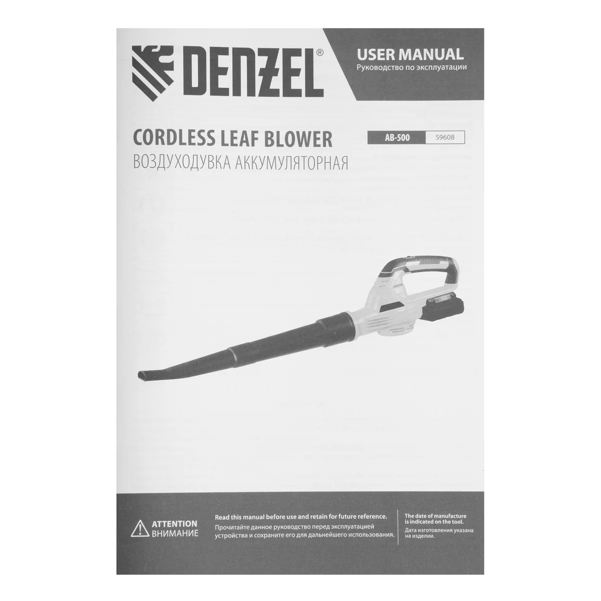 Воздуходувка аккумуляторная, AB-500, 60 м/с, 500 м3/ч, Li-Ion, 20 В Denzel 59608
