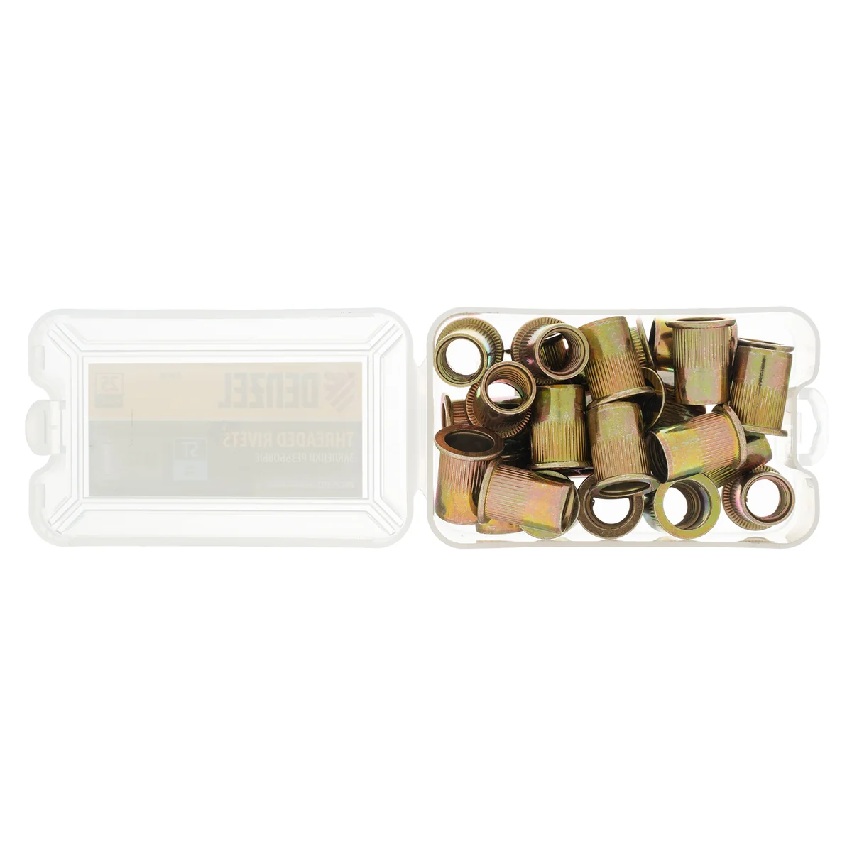 Стальные резьбовые заклепки Denzel 40606 с резьбой M12, оцинкованные, предназначены для скрепления листовых материалов толщиной 1-4 мм. Совместимы с заклепочником Denzel 40501. Позволяют получить резьбовое соединение даже при одностороннем доступе к месту крепления. Крепежные элементы используются для проведения строительных и монтажных работ, пригодятся на даче и в гараже.