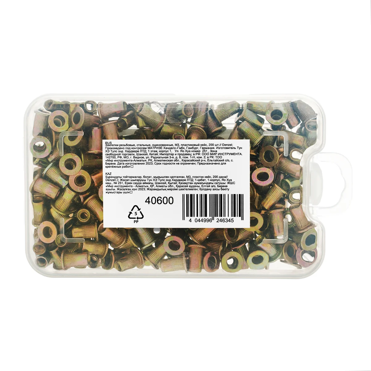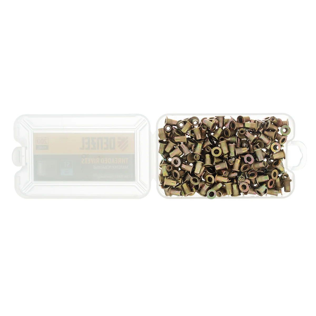 Стальные резьбовые заклепки Denzel 40600, с резьбой M3, оцинкованные, предназначены для скрепления листовых материалов толщиной 0,5-1,5 мм. Совместимы с заклепочником Denzel 40501. Позволяют получить резьбовое соединение даже при одностороннем доступе к месту крепления. Крепежные элементы используются для проведения строительных и монтажных работ, пригодятся на даче и в гараже.
