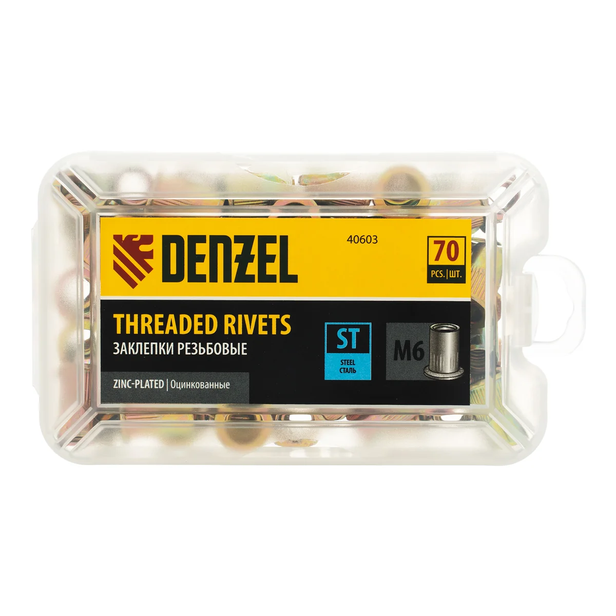 Стальные резьбовые заклепки Denzel 40603, с резьбой M6, оцинкованные, предназначены для скрепления листовых материалов толщиной 0,5-3 мм. Совместимы с заклепочником Denzel 40501. Позволяют получить резьбовое соединение даже при одностороннем доступе к месту крепления. Крепежные элементы используются для проведения строительных и монтажных работ, пригодятся на даче и в гараже.