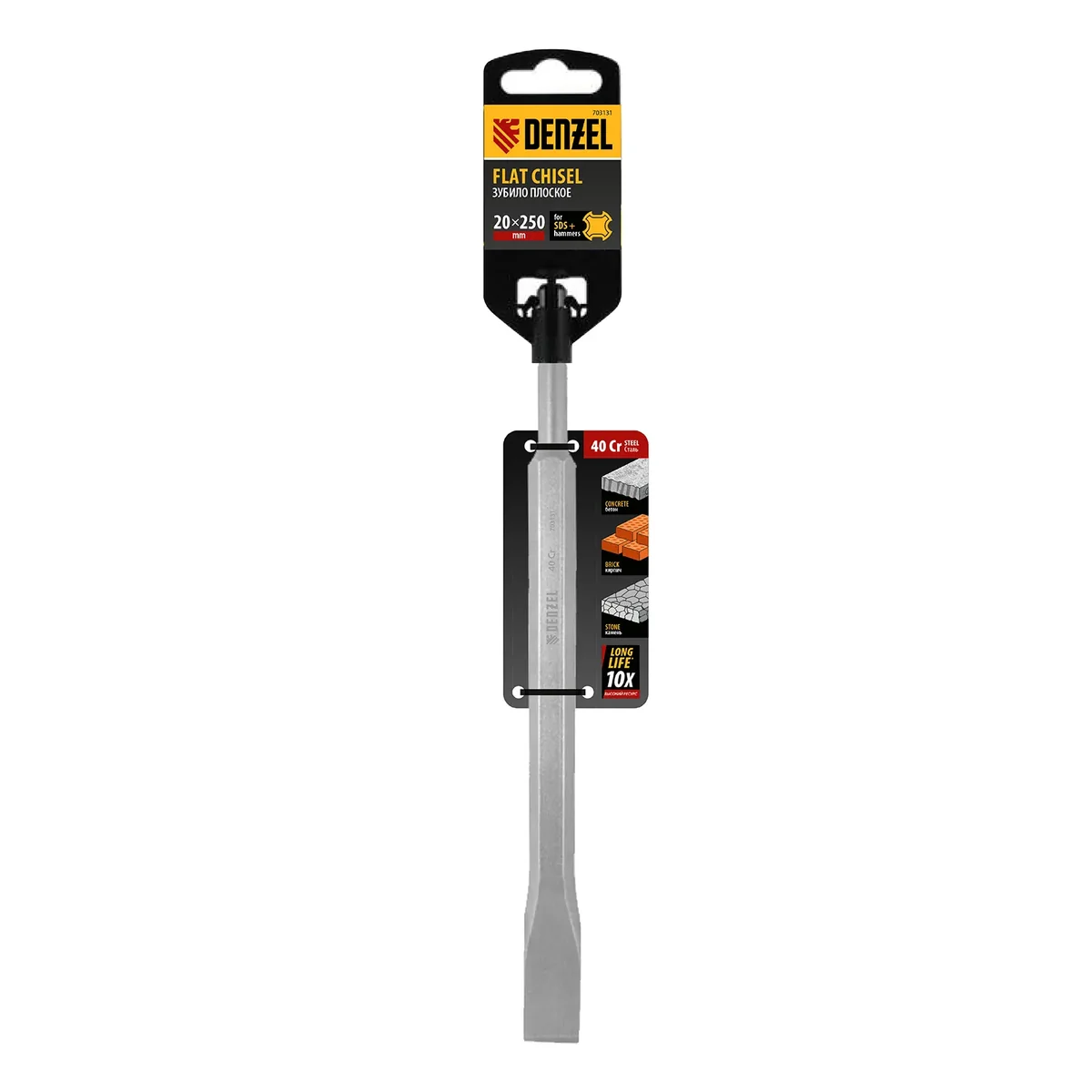 Зубило Denzel 703131 размером 14 x 20 x 250 мм, из стали 40Cr, с хвостовиком SDS-plus — оснастка для перфоратора. Предназначено для выполнения ударных, демонтажных работ с твердыми материалами, такими как камень, бетон, кирпич. Пригодится на строительной площадке.
