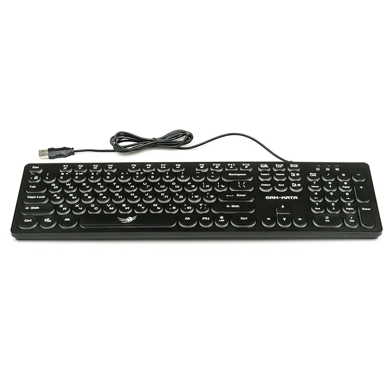 черный пластик. Белая латиница, белая кириллица. Клавиши с чёрной рабочей поверхностью и просвечивающими боковинами. Символы просвечиваются при включенной подсветке |