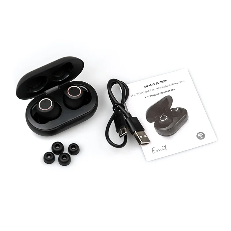 Наушник-вставка левый и правый, контейнер для хранения и зарядки наушников, USB Type A - micro USB type C кабель для зарядки контейнера, чёрные силиконовые накладки - два запасных комплекта разных размеров, инструкция с гарантийным талоном, упаковка |