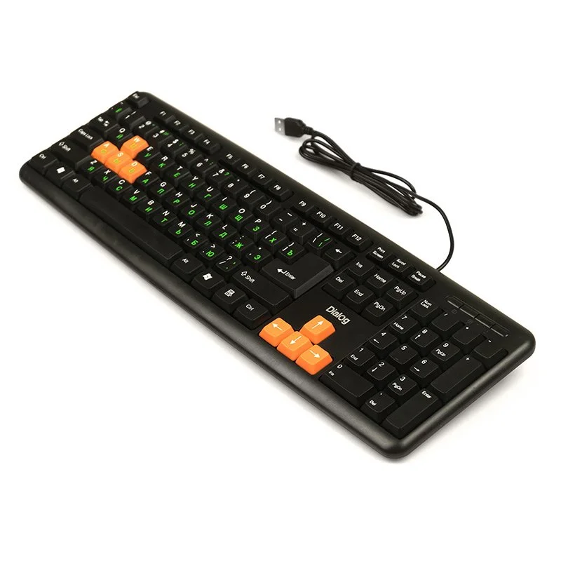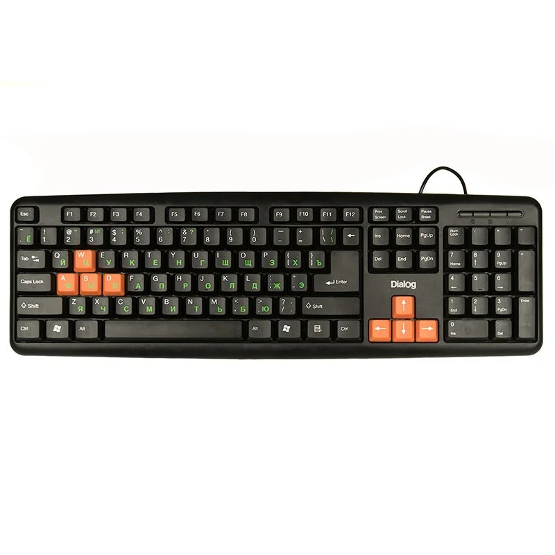 Черный пластик, черные клавиши, оранжевые клавиши курсора и WASD, белая латиница, зелёная кириллица |