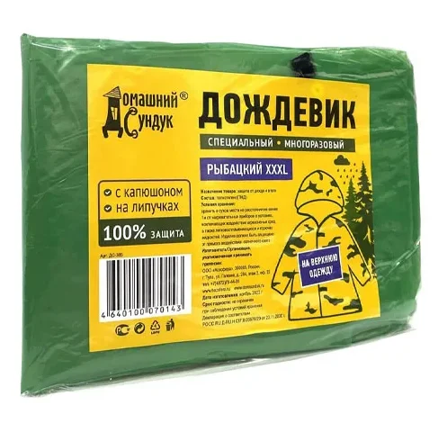 Дождевик Рыбацкий — простое и надежное решение в дождливую погоду. Изготовлен из прочного материала, легкий и компактный, на липучках. Специальный непромокаемый плащ надевается поверх одежды и предохраняет от влаги. Высокопрочный дождевик с капюшоном представлен в размере XXXL. Цвет в ассортименте. Защитит не только от дождя, но и от измороси и снега. Выполнен из полиэтилена низкого давления. Капюшон обеспечивает дополнительную защиту в непогоду.