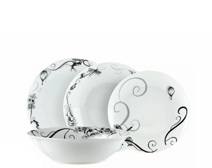 В состав набора входят 6 обеденных, 6 суповых, 6 десертных тарелок и 1 большой салатник. Тарелки можно мыть в посудомоечной машине и использовать в СВЧ печах.