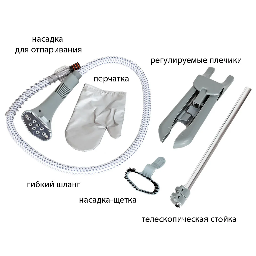 отпариватель, гибкий шланг, телескопическая стойка, насадка для отпаривания, держатель насадки, регулируемые плечики, насадка-щетка, перчатка, гарантийный талон, руководство по эксплуатации