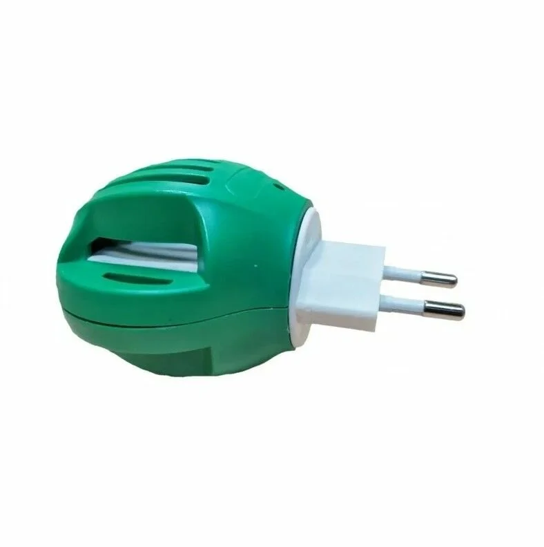 . Универсальный электрофумигатор, при использовании которого нужно вставить флакон с жидкостью от комаров и плотно прикрутить, затем включить прибор в электросеть и повернуть вилку так, чтобы флакон располагался вертикально. Средство начинает действовать через 10–15 минут после включения, а уничтожение комаров достигается за 1–2 часа. Запрещается одновременное применение флакона с жидкостью и пластины.