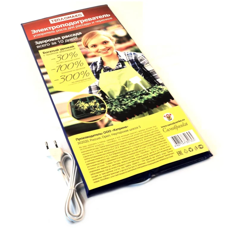Электроподогреватель «ТеплоМакс» для проращивания семян рассады размером 50х25 см произведён в России, компания-производитель — ООО «Катрина» (г. Орёл).