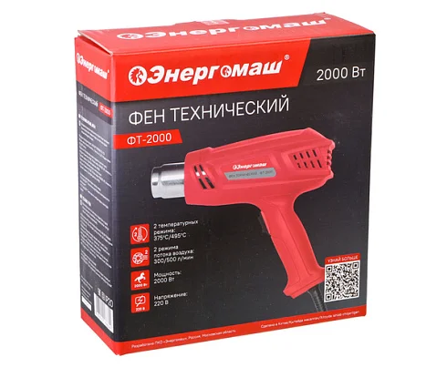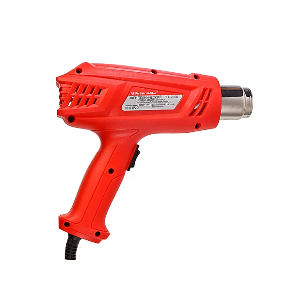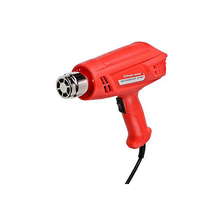 Энергомаш ФТ-2000 — надежный и простой в работе технический фен бытового назначения. Благодаря небольшой массе и компактным размерам модель обладает отличной маневренностью — уверенно контролируется и позволяет эффективное применение в условиях ограниченного пространства. Устройство может использоваться не только как мобильное, но и как стационарное — особая форма корпуса со специальной плоской основой дает возможность для большего удобства устанавливать фен в вертикальном положении. Инструмент имеет два рабочих температурных режима, которые совмещены с двумя скоростями воздушного потока: первый режим пониженной производительности обеспечивает максимальную температуру нагрева в 375°C при скорости выдува воздушного потока 300 л/мин, второй режим повышенной производительности — максимальная температура нагрева 495°C при скорости выдува воздушного потока 500 л/мин. Управление режимами происходит посредством специального переключателя. Для наиболее полного использования функционала в штатную комплектацию фена входят рефлекторное и редукционное сопла: рефлекторное сопло предназначено для разогрева пластиковых труб перед их изгибом в проектное положение в процессе монтажа, редукционное фокусирующее сопло применяется при точечной сварке, для герметизации стыков с помощью специальных наплавляемых лент, пайки медных труб и фитингов бесконтактным методом, при склеивании горячим способом любых материалов и в качестве переходника для фигурных или шлицевых насадок.