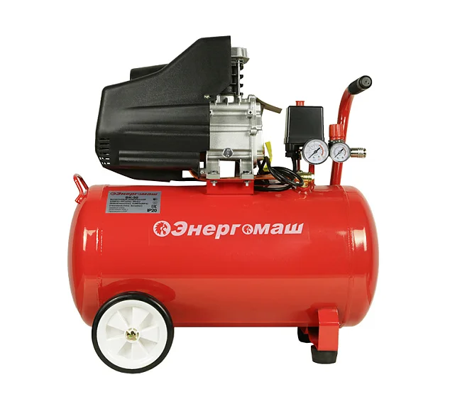 Энергомаш ВК-50 – универсальный поршневой масляный компрессор – рассчитан на широкую область применения и идеально подходит для работы с различными видами пневматического инструмента с рабочим давлением не более 8 бар. Модель имеет 50 литровый ресивер и характеризуется умеренными габаритными размерами и относительно небольшим весом, благодаря чему удобна в хранении и транспортировке. Максимальная производительность агрегата составляет 210 л / мин – этого вполне достаточно для использования продувочного пистолета, небольшого гайковерта или краскопульта. Компрессор оснащен надежным двигателем мощностью 1,5 кВт и одноцилиндровым компрессорным блоком из литого чугуна, что способствует его высокому ресурсу. Предусмотрена защита от перегрева и перегрузки. Для защиты двигателя и его лучшего охлаждения на модели установлен специальный защитный кожух. Привод компрессорного блока – прямой (коаксиальный), непосредственно от вала двигателя – это упрощает конструкцию и делает ее более компактной. Компрессор прост в эксплуатации и обслуживании: все органы управления и контроля рабочего процесса скомпонованы в единый блок и находятся на виду: пара манометров для контроля давления в ресивере и магистрали, прессостат (регулятор контроля давления) с выключателем, клапан для сброса давления. При необходимости с помощью крана-регулятора пользователем может производиться настройка оптимального выходного давления в магистрали. На дне ресивера установлен дренажный клапан для слива конденсата. Мобильность перемещения модели обеспечивается наличием транспортировочных колес и рукояти.