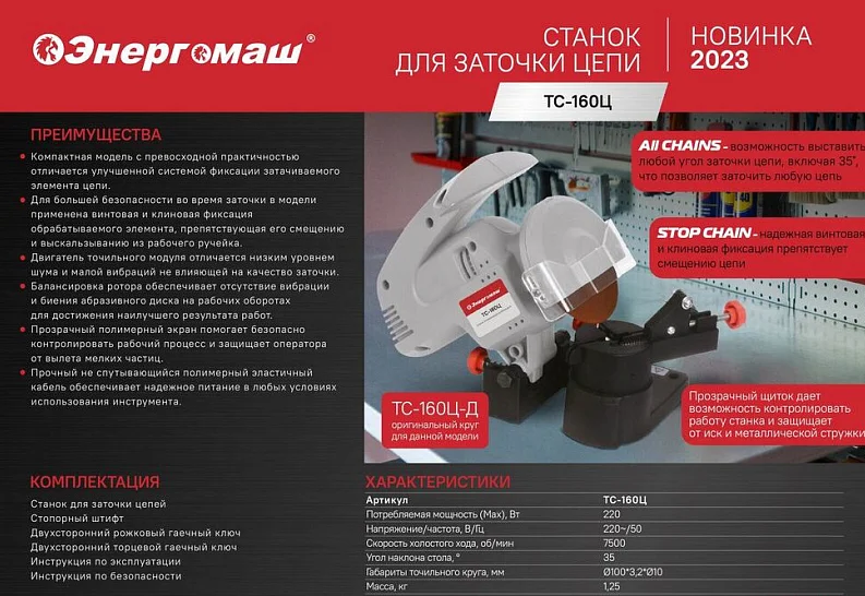 Заточной станок Энергомаш ТС-160Ц. Компактная модель с превосходной практичностью отличается улучшенной системой фиксации затачиваемого элемента цепи.