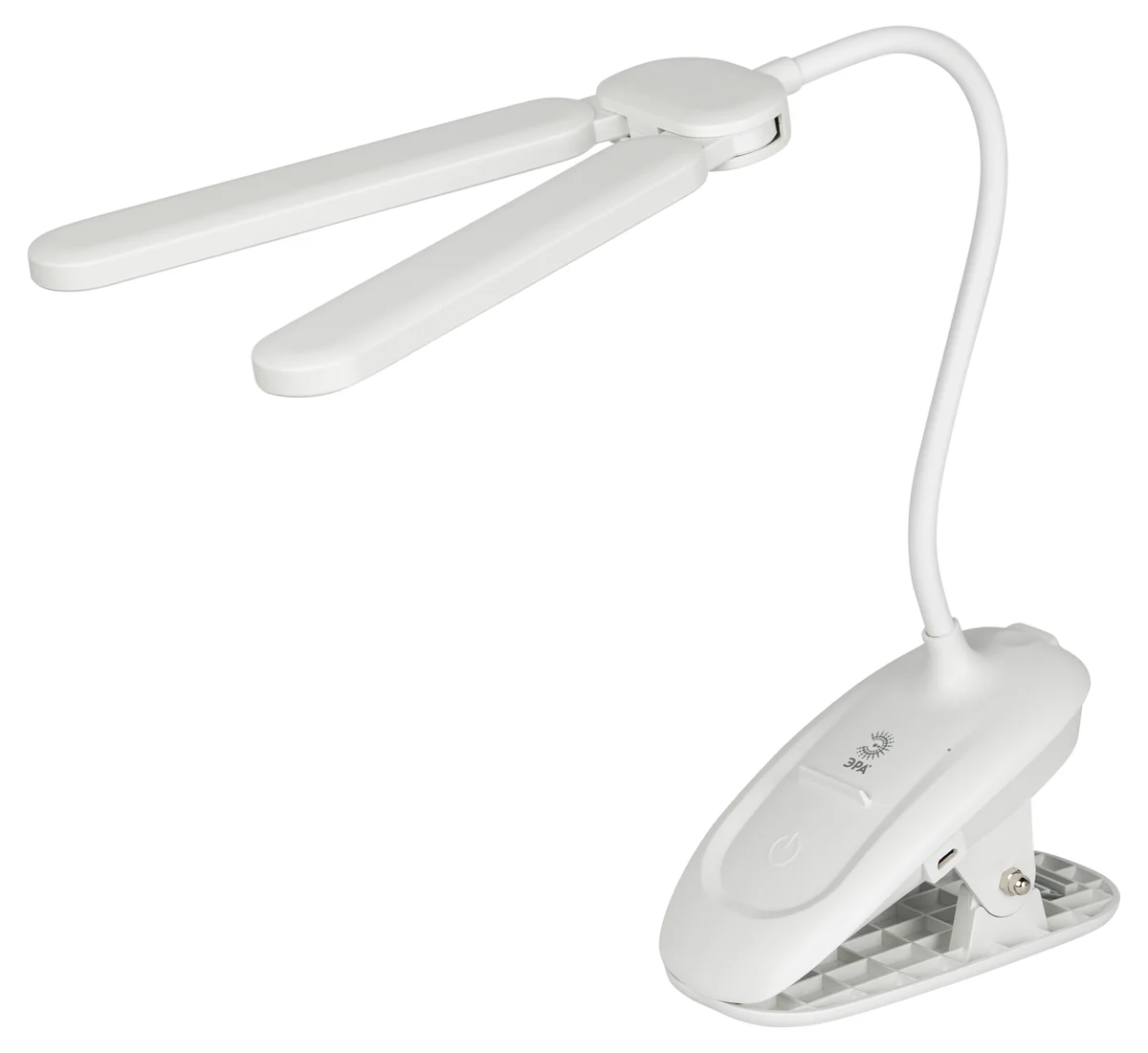 Настольный светильник с двойным плафоном со светодиодами (LED) в качестве источников света. Встроенный литиевый аккумулятор, подзарядка от USB. Изменяемая цветовая температура. На прищепке. USB кабель в комплекте. Сенсорное управление. Плавный диммер. Гибкая стойка.