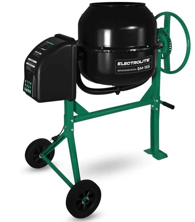 Бетоносмеситель ELECTROLITE БМ-165 (объем 165/123 л, мощность 800Вт, сеть 220В/50Гц, венец чугун, разборный подшипник,вес 52кг)