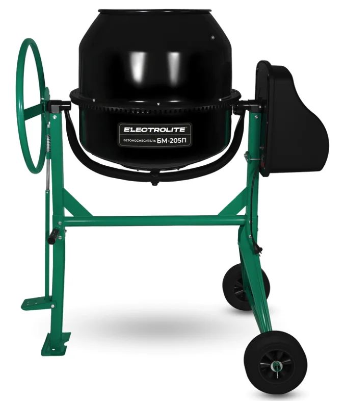 Бетоносмеситель ELECTROLITE БМ-205П (объем 205/153л, мощность 1100Вт, сеть 220В/50Гц,фиксация барабана педалью, резиновые колеса, венец чугун, разборный подшипник, вес 61кг)
