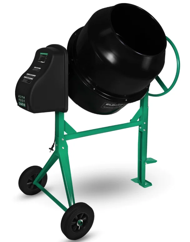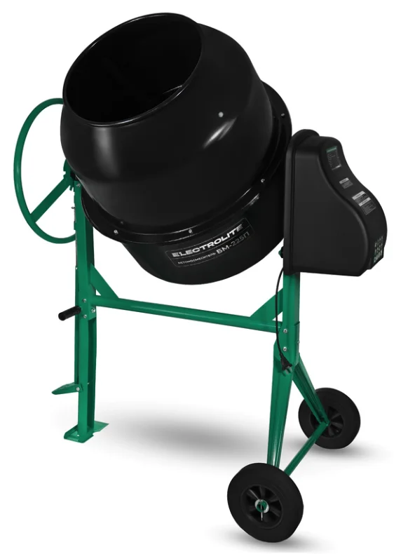 Бетоносмеситель ELECTROLITE БМ-225П (объем 225/168л, мощность 1200Вт, сеть 220В/50Гц, фиксация барабана педалью, резиновые колеса, венец чугун, разборный подшипник, вес 80кг)