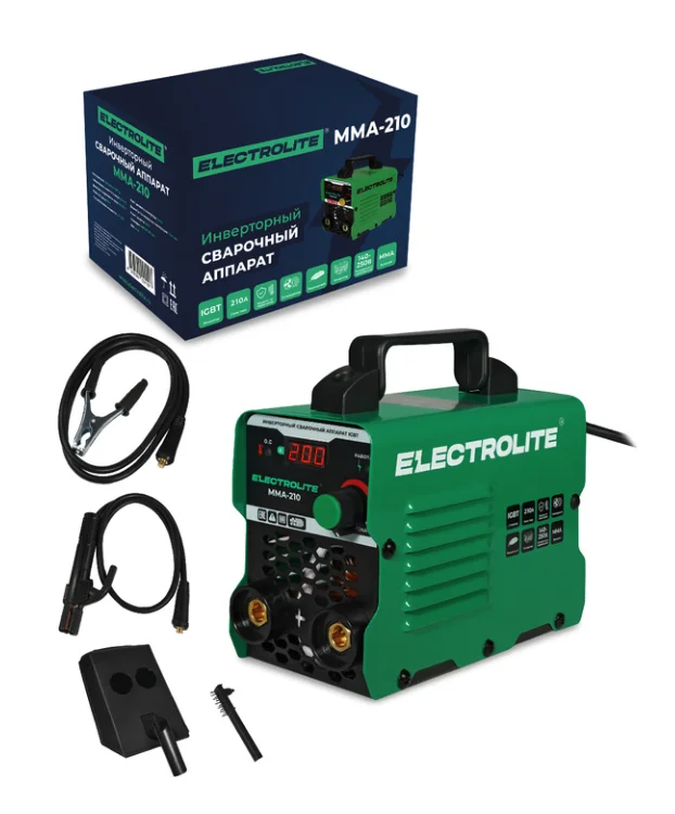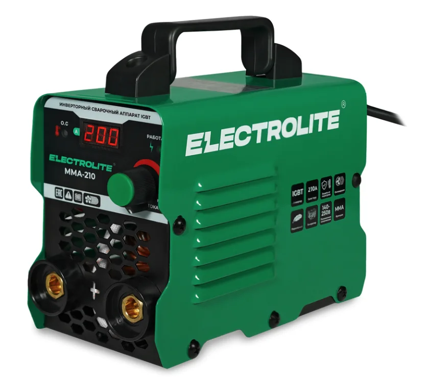 Сварочный инверторный аппарат ELECTROLITE MMA-210 аппарат для ММА-сварки плавящимися электродами. Инверторная сварка изготовлена по современной IGBT-технологии, что позволяет сохранять компактные размеры и вес 2,5 кг. Максимальный ток – 210 А, его хватает для полноценной работы с электродом максимальным диаметром 4 мм. Инверторный сварочный аппарат для сварки сталей, меди, цветных и чёрных металлов и т.д. Функция «Hot Start» резко повышает стартовый ток. Функция «Anti Stick» прерывает подачу тока при залипании электрода. Электрод удаляется с заготовки, без нарушения ровности шва. Принудительное туннельное охлаждение защищает инвертор от перегрева. Форма вентиляционных отверстий предотвращает попадание окалины внутрь инвертора. Аппарат не пострадает от попадания брызг металла. При превышении рабочей температуры сварочный аппарат прервёт работу. Внутренние узлы не пострадают от перегрева. Главным преимуществом сварочного аппарата является встроенная система, позволяющая использовать аппарат при низком напряжение в сети от 140 вольт до 250 вольт.