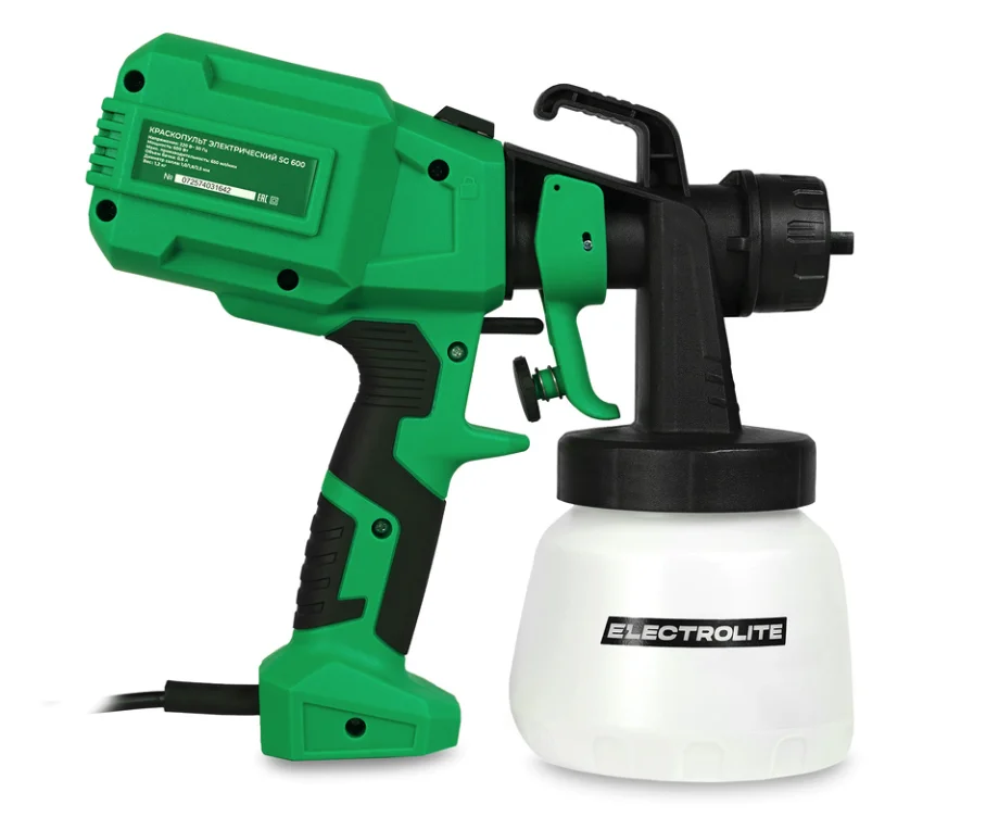 Краскопульт электрический Electrolite SG-600 это многофункциональный инструмент для обработки эмали, лаки, грунтовки и другие покрытия равномерным слоем. Мощность двигателя составляет 600 Вт, питание осуществляется от сети 220 В, 50 Гц. Производительность 650 мл/мин обеспечивает равномерное покрытие поверхности без потеков и лишнего расхода краски.