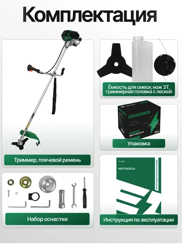 В комплект мотокосы Electrolite XT-630 входят триммерная головка, режущий нож и плечевой ремень. Это позволяет использовать инструмент как кусторез для более жёсткой растительности.