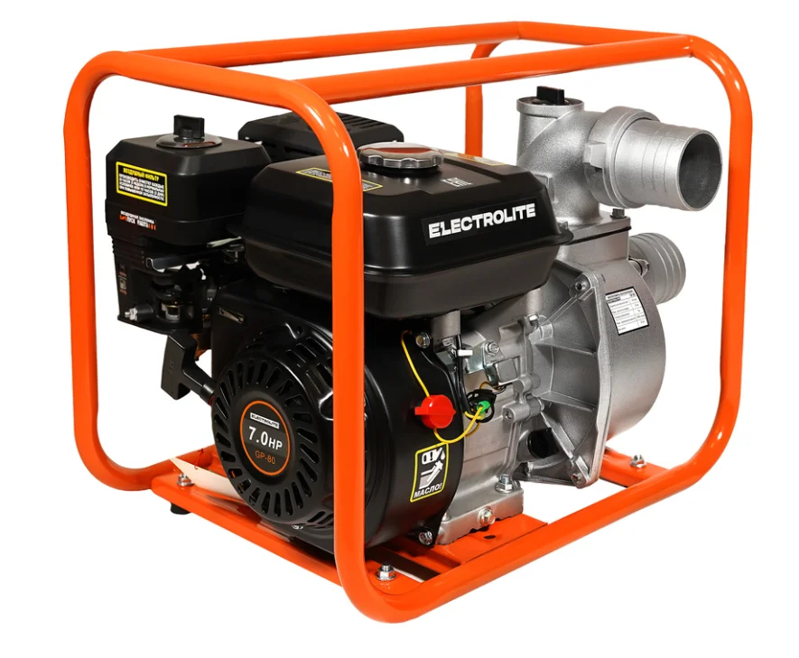 Мотопомпа ELECTROLITE GP-80 (7л.с., 80мм, 1300л/мин, глубина всасывания 8м., макс. напор 30м., вес 25кг.)