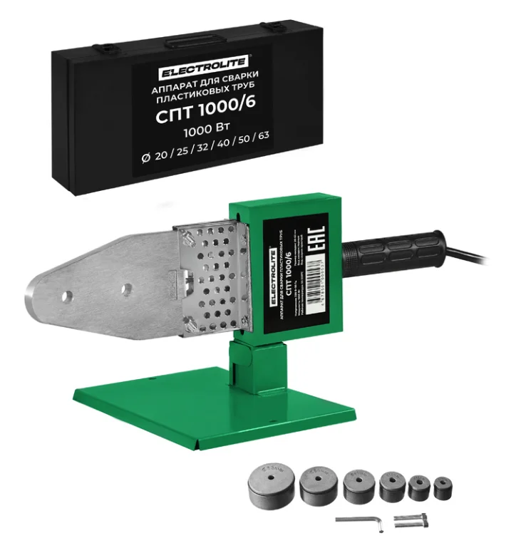 Паяльник пластиковых труб ELECTROLITE СПТ 1000/6 способен достигать оптимальной температуры и времени нагрева для правильного соединения полипропиленовых труб и фитингов. При работе с паяльником необходимо соблюдать правила безопасности и следовать инструкции производителя. Аппарат для ручной сварки пластиковых труб и фитингов укомплектован насадками для возможности сварки труб разного диаметра (20/25/32/40/50/63 мм). Расплавленные заготовки легко снимаются с нагревательного элемента. Использование данного аппарата значительно ускоряет рабочий процесс.
