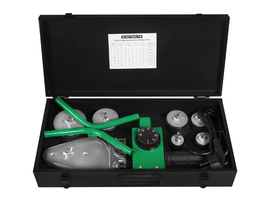 Паяльник для ПВХ ELECTROLITE СПТ 1500/6 (5шт/кор) (1500Вт, насадки в комплекте 20/25/32/40/50/63 мм, температура нагрева 50-300 °С, металлический кейс)