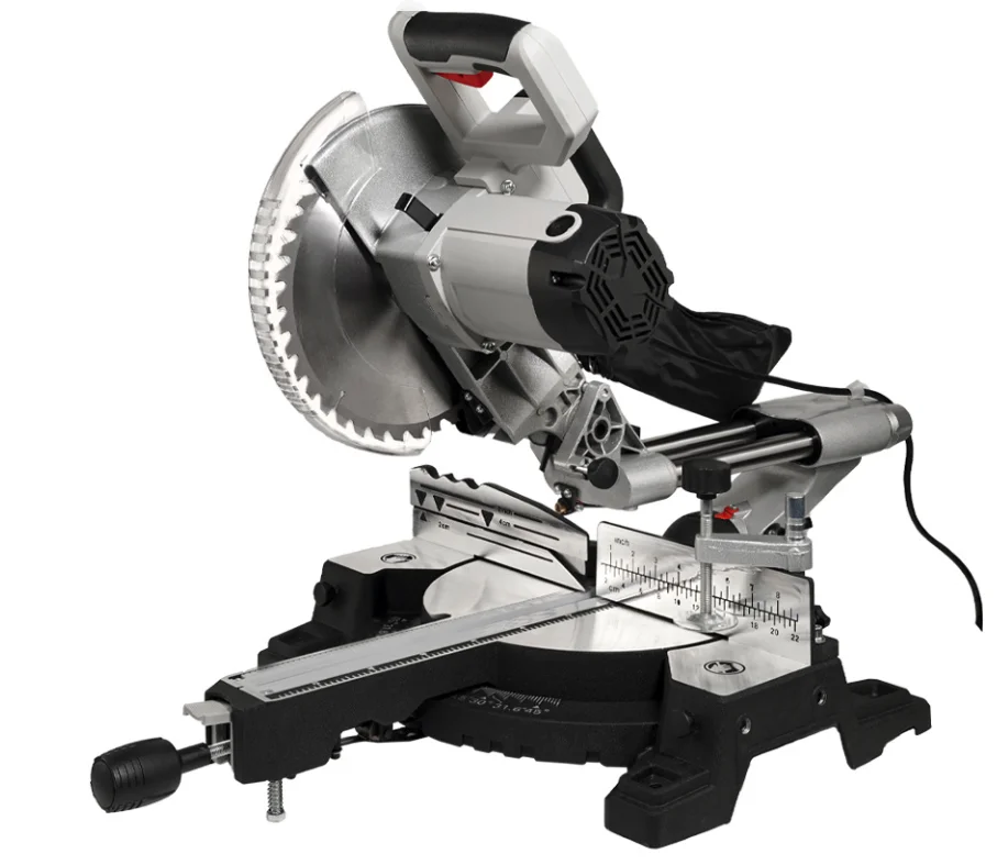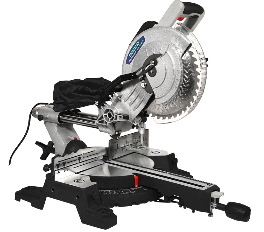 - Пильная головка наклоняется в левую или правую сторону и регулируется в диапазоне 0-45 градусов;