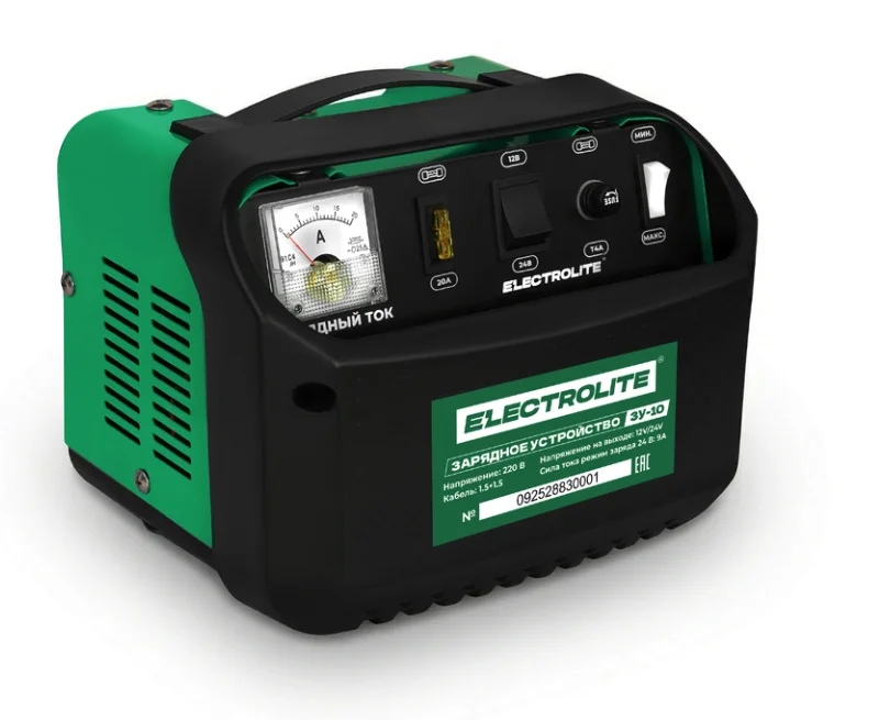 Зарядное устройство для аккумулятора Electrolite ЗУ-10 компактный и удобный прибор для зарядки кислотных АКБ грузовиков, легковых авто, скутеров, катеров и снегоходов. С помощью аппарата можно восстанавливать частично разряженные батареи, а также заряжать полностью севшие и необслуживаемые АКБ.