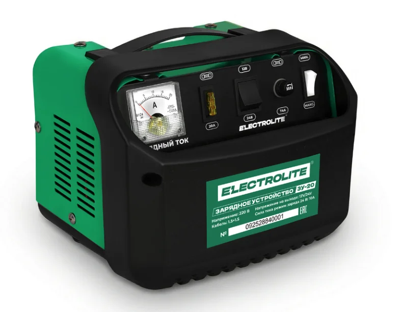 Зарядное устройство ELECTROLITE ЗУ-20 (Вых. напр.-12/24В, Зар. ток-7/10А, Ёмкость АКБ-40-120Ач, Вес-4,4кг)