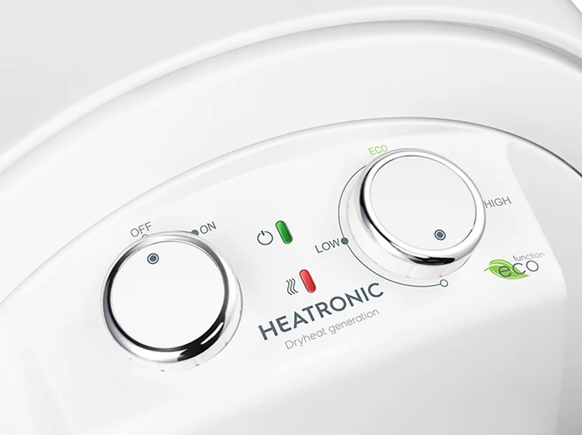 На нижней крышке водонагревателя расположена удобная панель управления. На ней размещены ручка включения прибора и ручка терморегулятора, с помощью которой можно задать нужную температуру нагрева воды в диапазоне от 30 до 75°С. При выборе на панели управления функции экономного режима (положение «ЕCO»), вода будет нагреваться до температуры 55°С. При такой температуре повышается рабочий ресурс ТЭНа, происходит обеззараживание воды и практически не образуется накипь.