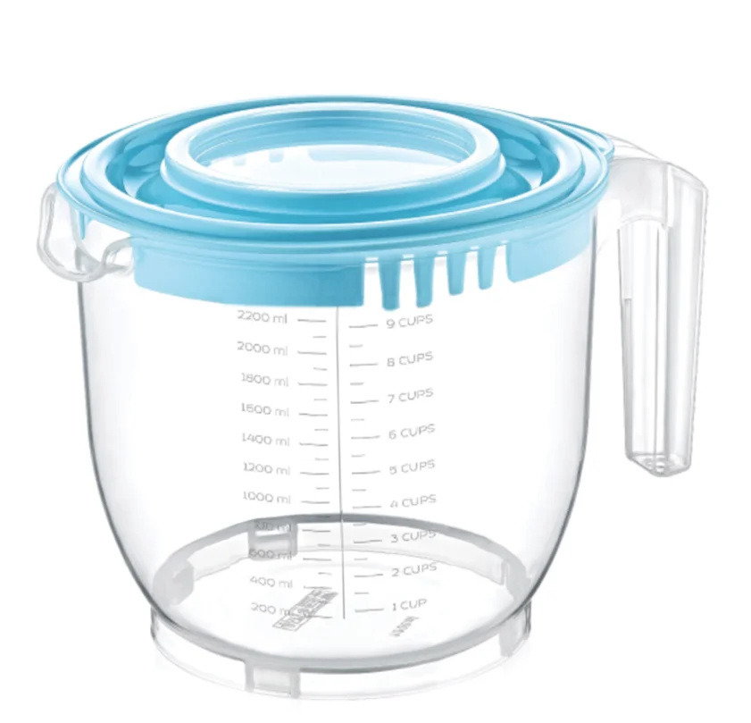 Ёмкость для миксера 2,2 л. - может понадобиться для приготовления сложных блюд или обработки большого количества продуктов. Пользоваться ёмкостью удобно, если Вы работаете с жидкими составами, например, с бисквитным тестом. Плоское дно обеспечивает высокую устойчивость при работе и исключает разбрызгивание. Удобная ручка позволит легко переносить ёмкость и работать с содержимым. Предусмотрен носик для точного и удобного переливания жидких продуктов. На лицевой стенке по вертикали расположена мерная шкала с цифровыми показателями долей литра. Плотная крышка позволяет использовать ёмкость для хранения и замораживания в морозильной камере, мыть в посудомоечной машине.